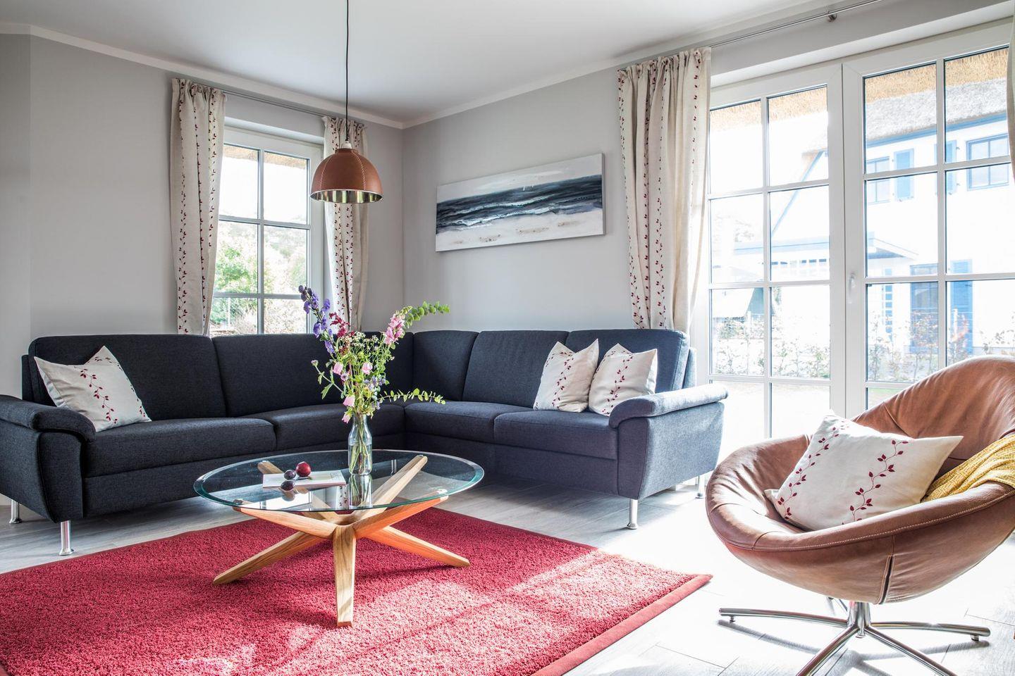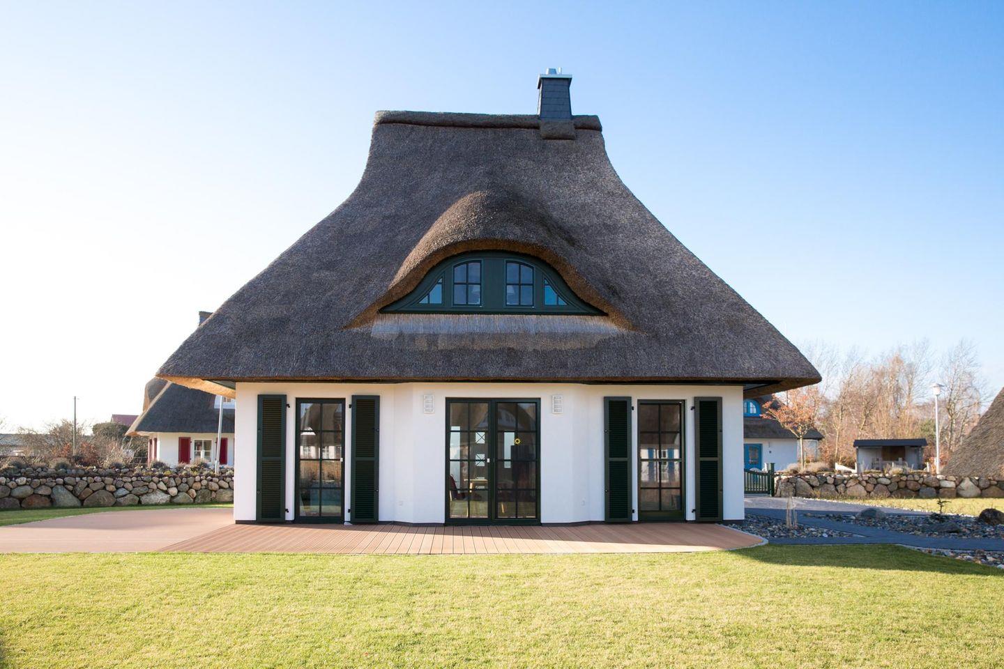 Dieses modern ausgestattete Ferienhaus mit traditionellem Reetdach, ortstypischer Feldsteineinfriedung und 720 m2 großem, komplett eingezäuntem Grundstück liegt in einer neuen Ferienhausanlage. Es bietet viel Platz für vier Feriengäste (zwei Schlafzimmer mit Doppelbett und TV) und verfügt über einen großzügigen Wohn-Essbereich, ein einladendes Wannen-/Duschbad mit WC und Sauna im OG sowie ein Gäste-WC im EG.