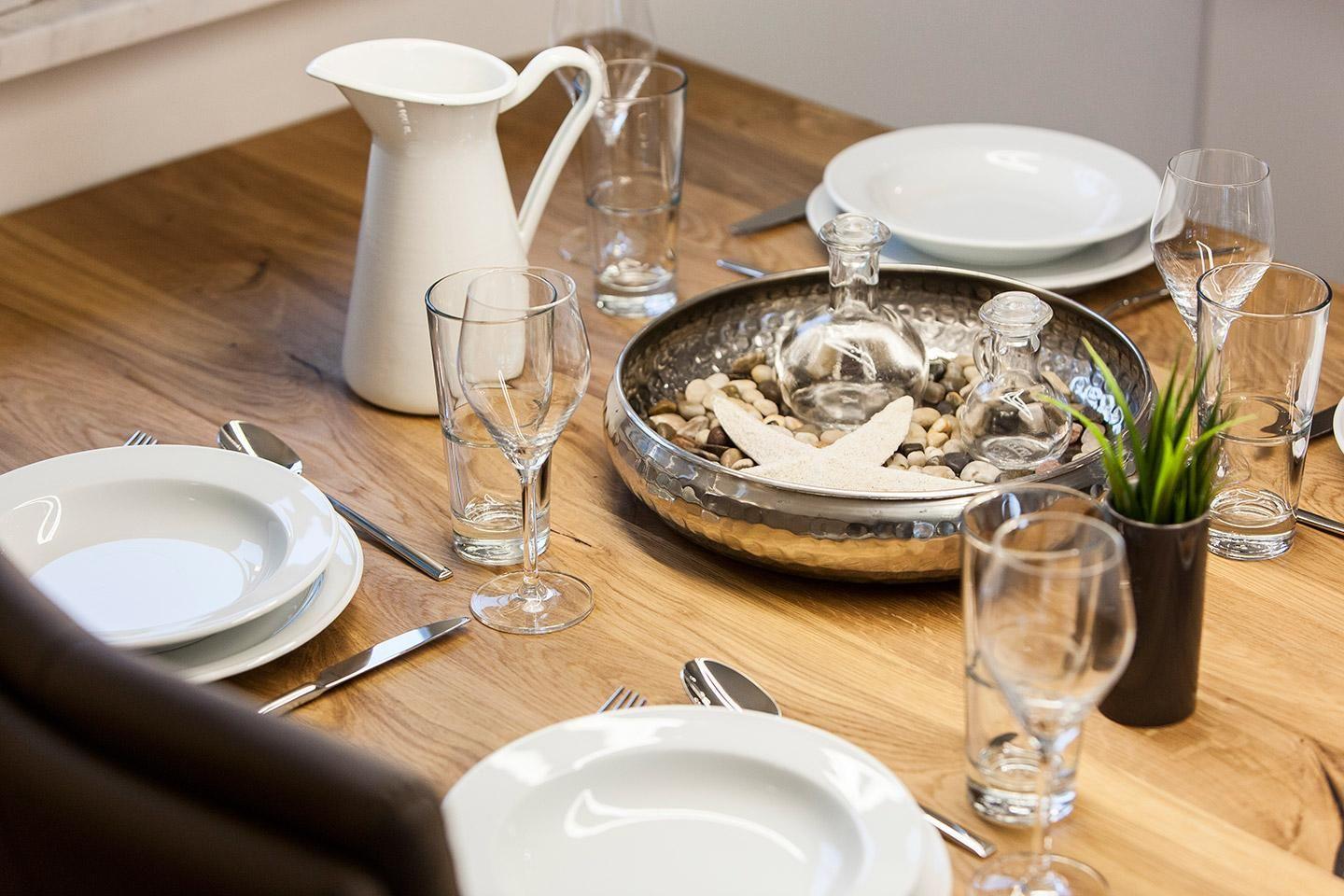 Im Erdgeschoss befindet sich ein ca. 30 qm großer Wohn-Essbereich mit gemütlichen Sitzmöglichkeiten, Kaminofen, SAT-TV mit Sky und neben einer komplett ausgestatteten Küche ist ein großer Esstisch für sechs Personen vorhanden. SAT-TV in zwei Doppelschlafzimmer. In dem Hauswirtschaftsraum befinden sich u.a. Waschmaschine, Bügeleisen und Bügelbrett und Reinigungsutensilien.