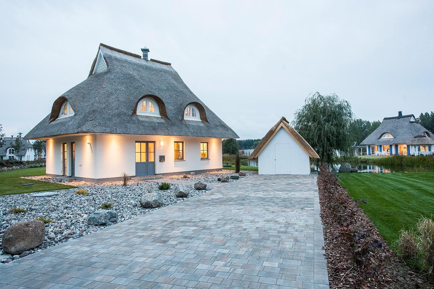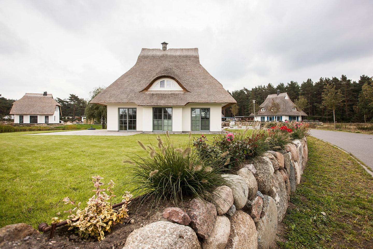 Dieses wunderschöne Ferienhaus mit traditionellem Reetdach, ortstypischer Feldsteineinfriedung und 740 m2 großem Grundstück am Teich liegt in einer neuen Ferienhausanlage. Es bietet großzügig Platz für sechs Feriengäste (drei Schlafzimmer mit Doppelbett, davon eins im EG) und verfügt über zwei hochwertige Bäder und ein Gäste-WC, davon ein Bad mit Badewanne und Dusche, ein Bad mit Dusche und Sauna.