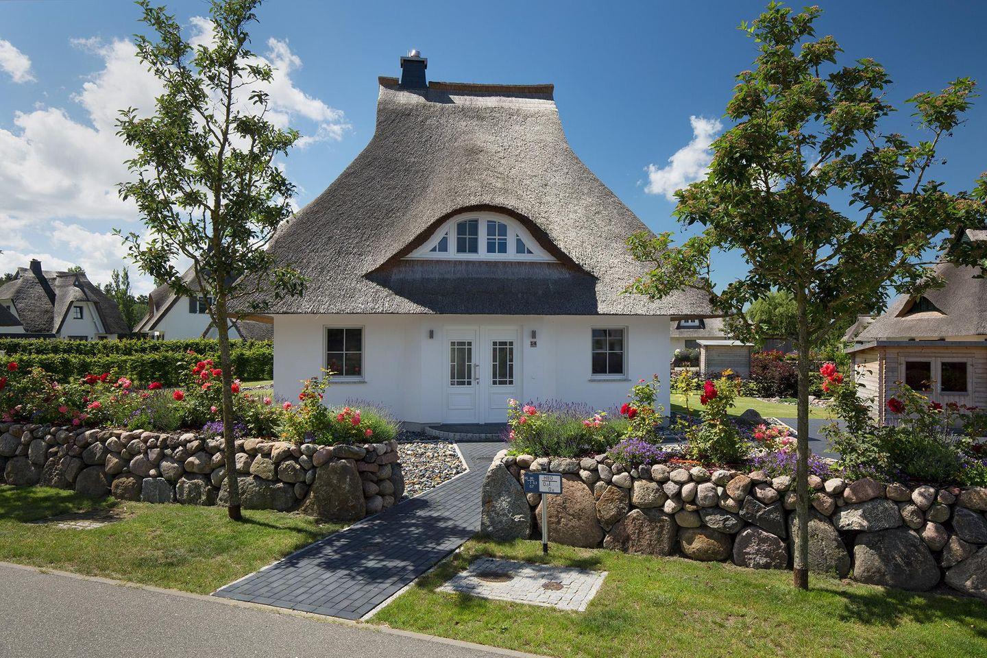 Dieses modern ausgestattete Ferienhaus mit traditionellem Reetdach, ortstypischer Feldsteineinfriedung und 715 m2 großem Grundstück liegt in einer neuen Ferienhausanlage. Es bietet viel Platz für vier Feriengäste (zwei Schlafzimmer mit Doppelbett und TV) und verfügt über einen großzügigen Wohn-Essbereich, ein einladendes Wannen-/Duschbad mit WC und Sauna im OG sowie ein Gäste-WC im EG.