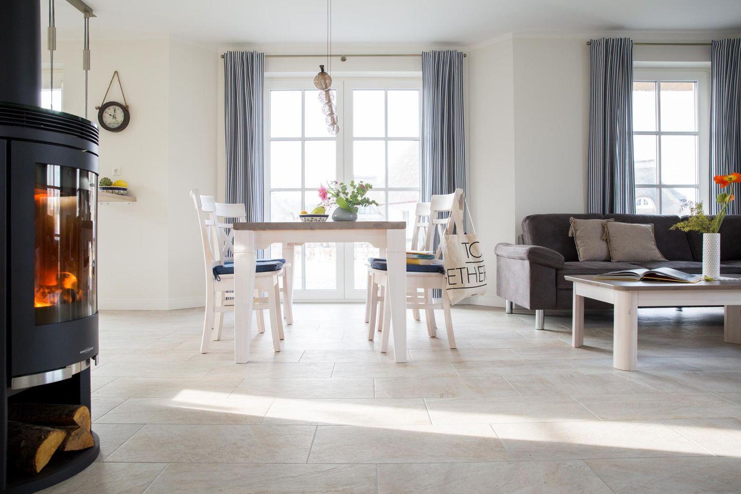 Im EG befindet sich ein ca. 36 qm großer Wohn-Essbereich mit gemütlicher Couch, Kaminofen, SAT-TV mit Sky und neben einer komplett ausgestatteten Küche ist ein Esstisch für 4 Personen vorhanden. Um Sie und Ihr Fahrzeug mit Strom mobil zu halten, haben wir die Infrastruktur geschaffen und stellen Ihnen einen Ladepunkt (kostenpflichtig) am Haus zur Verfügung.