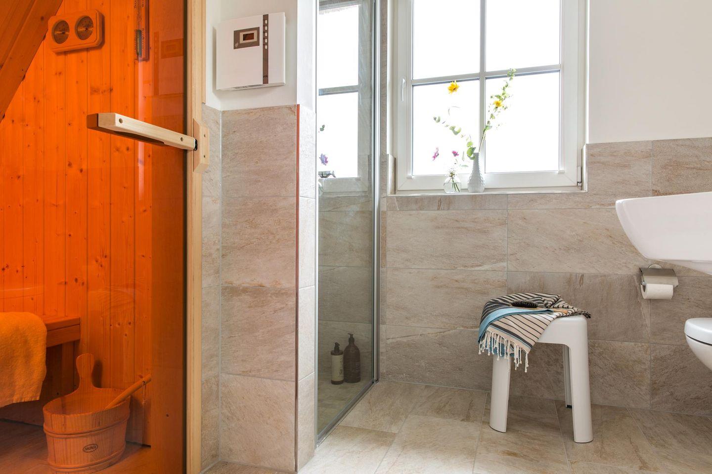 Das wunderschöne Ferienhaus mit traditionellem Reetdach, Fensterläden, ortstypischer Feldsteineinfriedung und 763 m2 großem Grundstück am Teich liegt in einer neuen Ferienhausanlage. Es bietet großzügig Platz für fünf Feriengäste (zwei Schlafzimmer mit Doppelbett, eins mit Einzelbett) und verfügt über ein Duschbad mit WC und Sauna im OG sowie ein Gäste-WC im EG.