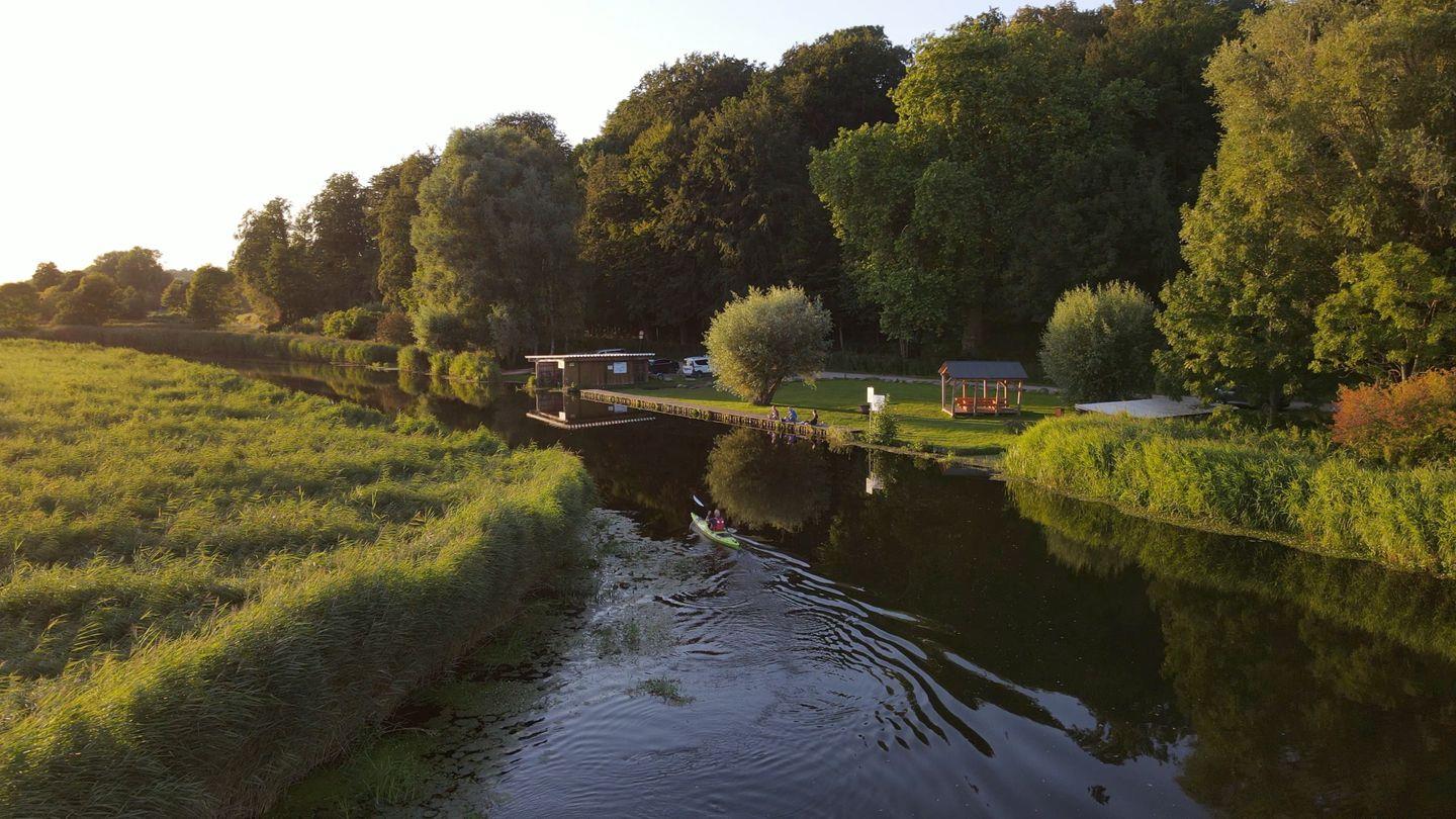 Im EG befindet sich ein ca. 30 qm großer Wohn-Essbereich mit gemütlicher Couchecke, Kaminofen, SAT-TV mit Sky und neben einer komplett ausgestatteten Küche ist ein Esstisch für 6 Personen vorhanden. Die großzügige Terrasse bietet einen herrlichen Blick auf den Teich und viel Morgen- und Abendsonne.