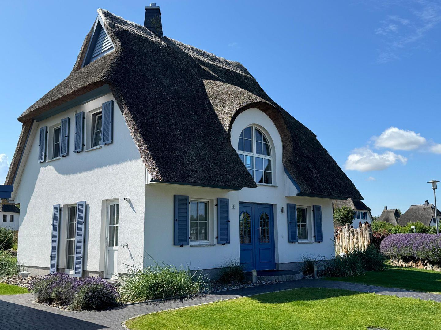 Das wunderschöne Ferienhaus mit traditionellem Reetdach, Fensterläden, ortstypischer Feldsteineinfriedung und 763 m2 großem Grundstück am Teich liegt in einer neuen Ferienhausanlage. Es bietet großzügig Platz für fünf Feriengäste (zwei Schlafzimmer mit Doppelbett, eins mit Einzelbett) und verfügt über ein Duschbad mit WC und Sauna im OG sowie ein Gäste-WC im EG.