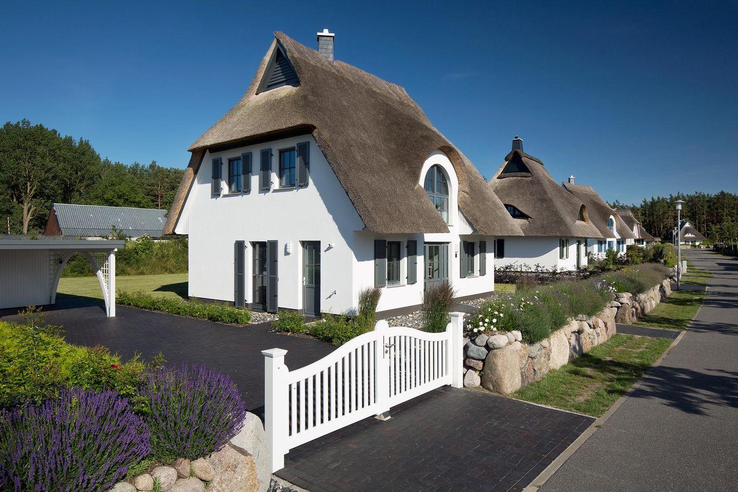 Das wunderschöne Ferienhaus mit traditionellem Reetdach, Fensterläden, ortstypischer Feldsteineinfriedung und 653 m2 großem Grundstück liegt in einer neuen Ferienhausanlage. Es bietet großzügig Platz für fünf Feriengäste (zwei Schlafzimmer mit Doppelbett, eins mit Einzelbett) und verfügt über ein Duschbad mit WC und Sauna im OG sowie ein Gäste-WC im EG.