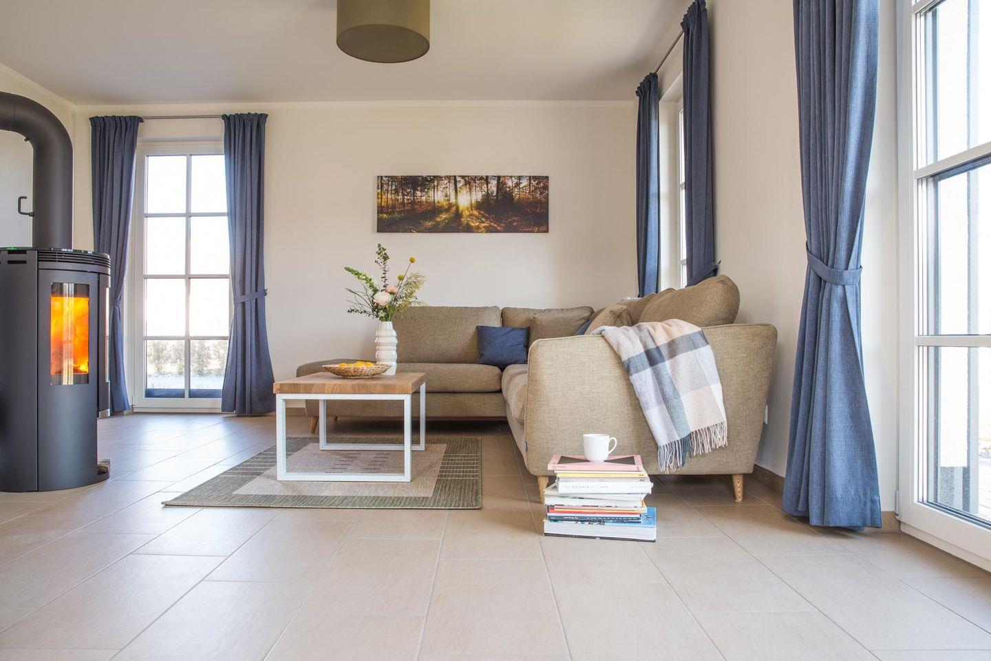 Das Ferienhaus Schilfrohrsänger 6 bietet in naturnaher Lage mit Sauna und Kaminofen erholsamen Komfort in Fuhlendorf.