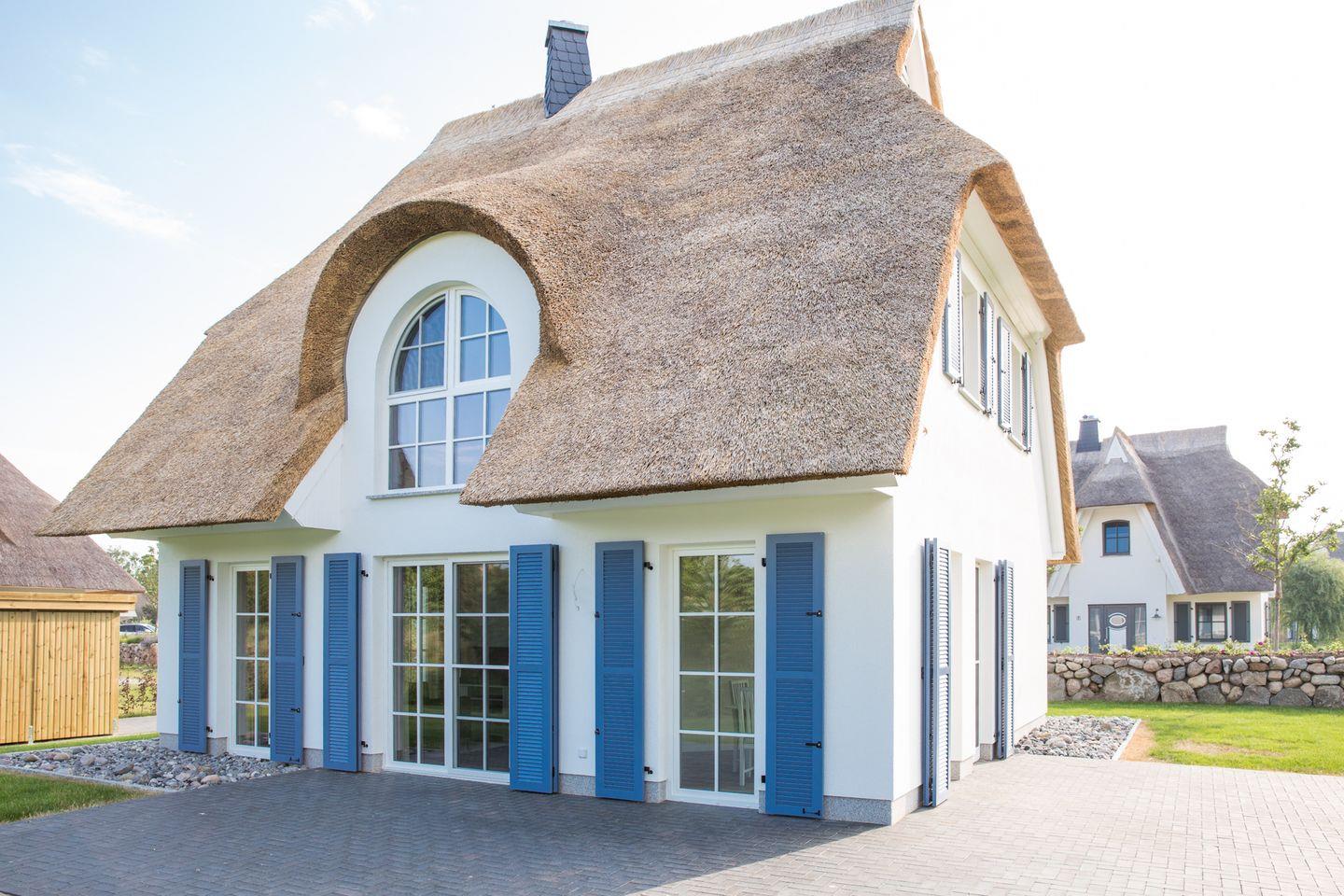 Das wunderschöne Ferienhaus mit traditionellem Reetdach, Fensterläden, ortstypischer Feldsteineinfriedung und 876 m2 großem Grundstück liegt in einer neuen Ferienhausanlage. Es bietet großzügig Platz für fünf Feriengäste (zwei Schlafzimmer mit Doppelbett, eins mit Einzelbett) und verfügt über ein Duschbad mit WC und Sauna im OG sowie ein Gäste-WC im EG.