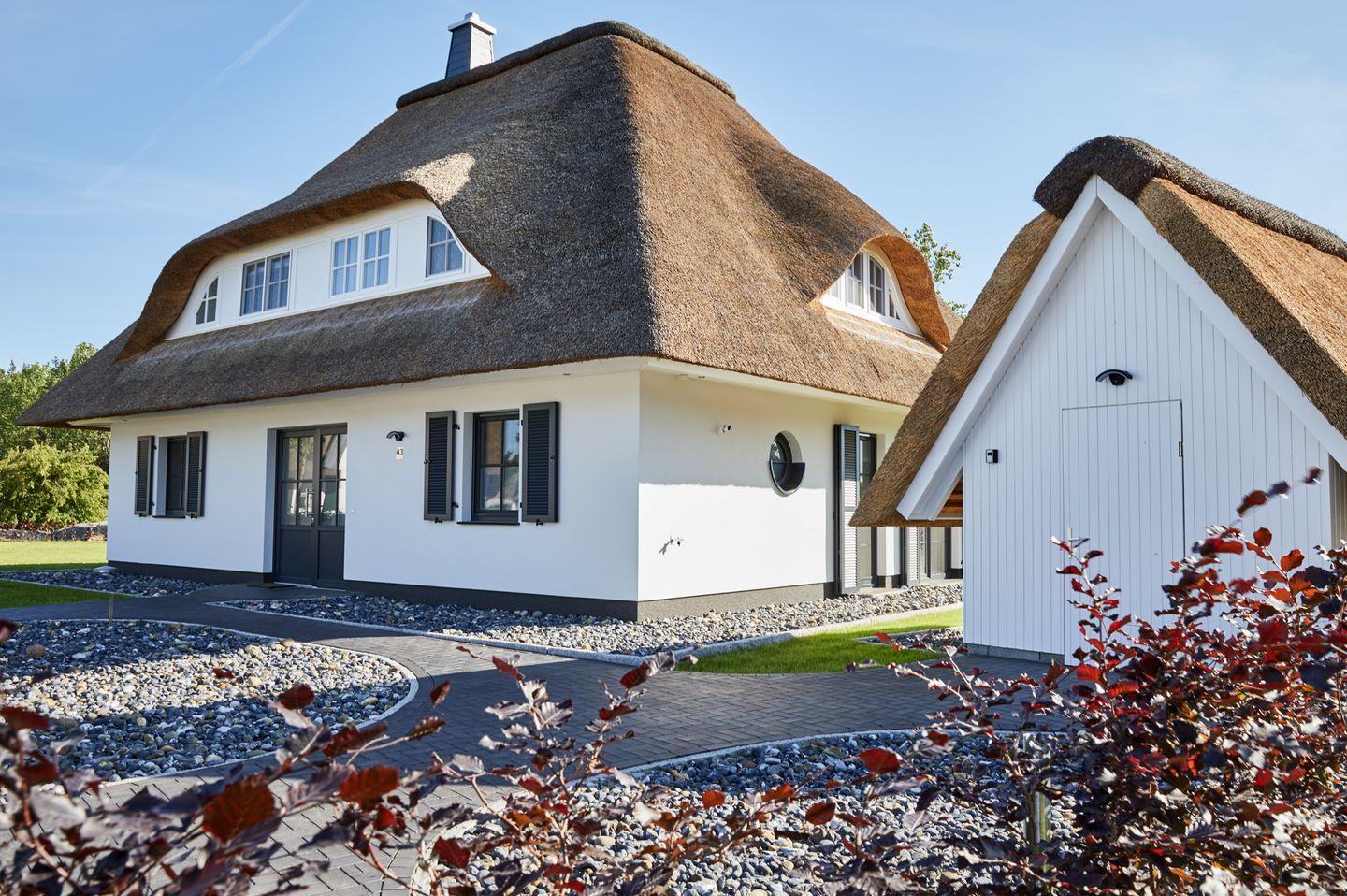 Dieses wunderschöne Ferienhaus mit traditionellem Reetdach, ortstypischer Feldsteineinfriedung und 1.468 m2 großem Grundstück liegt in einer neuen Ferienhausanlage. Es bietet großzügig Platz für acht Feriengäste (vier Schlafzimmer mit Doppelbetten (zwei Boxspringbetten), davon eins im EG) und verfügt über drei hochwertige Bäder und ein Gäste-WC, davon ein ein Bad mit Dusche im Erdgeschoss, Bad mit Badewanne und ein Bad mit Dusche und Sauna im Obergeschoss.