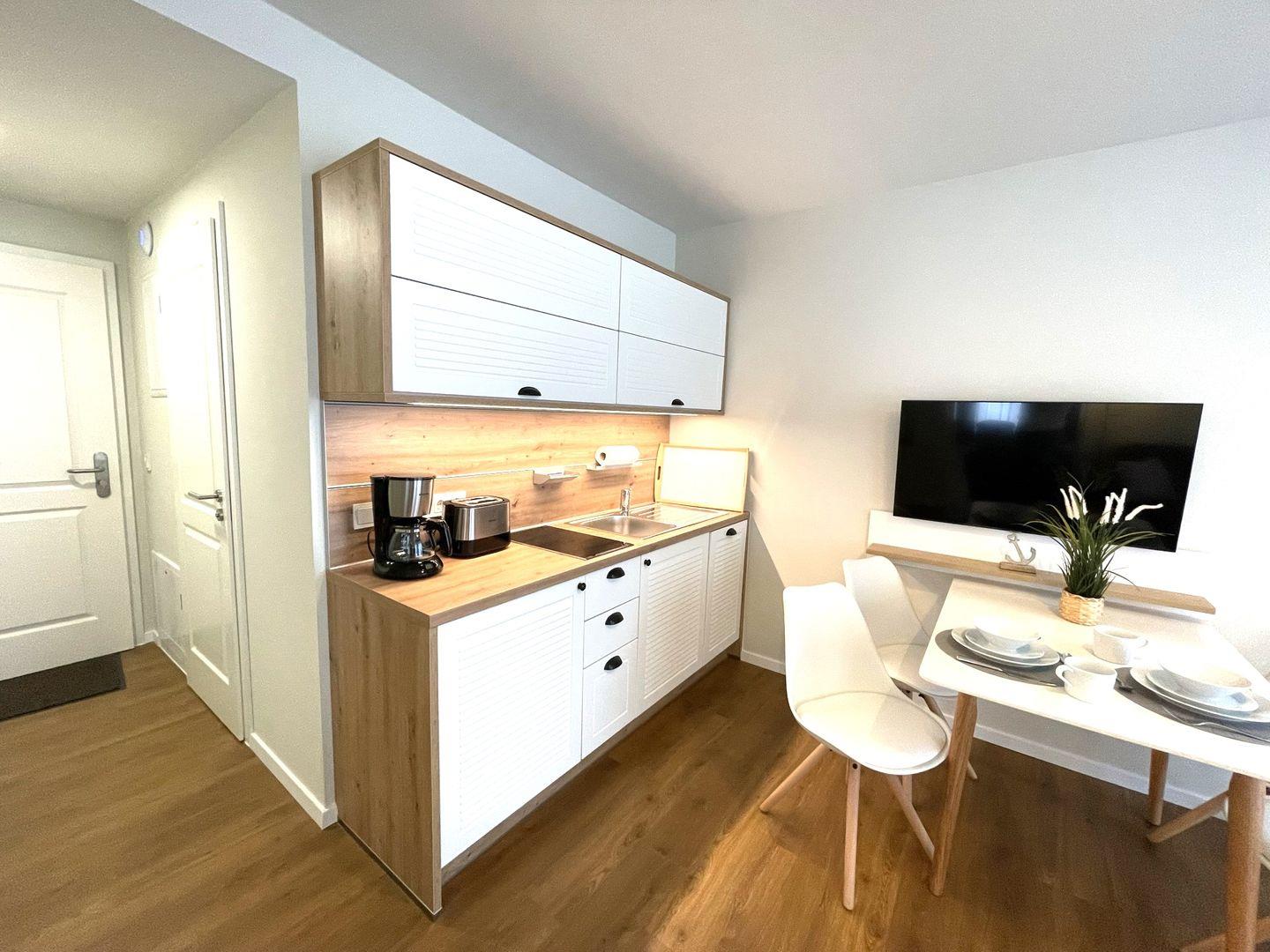 Die offene Pantryküche mit anliegendem Essbereich bieten Ihnen einen Geschirrspüler, Kühlschrank mit Gefrierfach, Kaffeemaschine, 2-Platten-Ceranfeld und Wasserkocher.