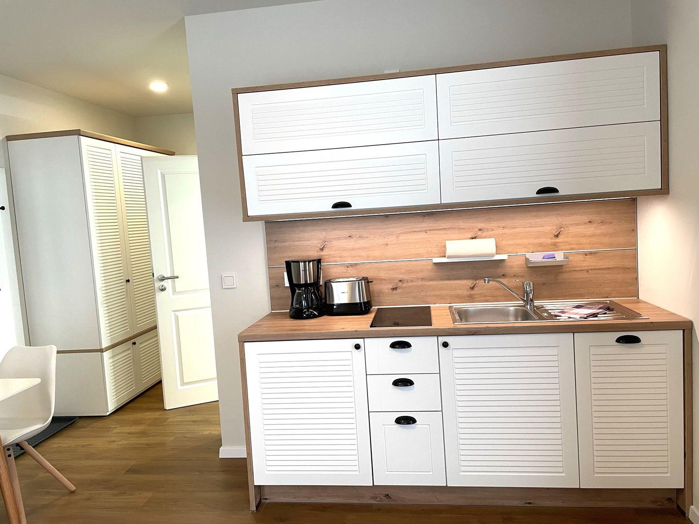 Die offene Pantryküche mit anliegendem Essbereich bieten Ihnen einen Geschirrspüler, Kühlschrank mit Gefrierfach, Kaffeemaschine, 2-Platten-Ceranfeld und Wasserkocher.