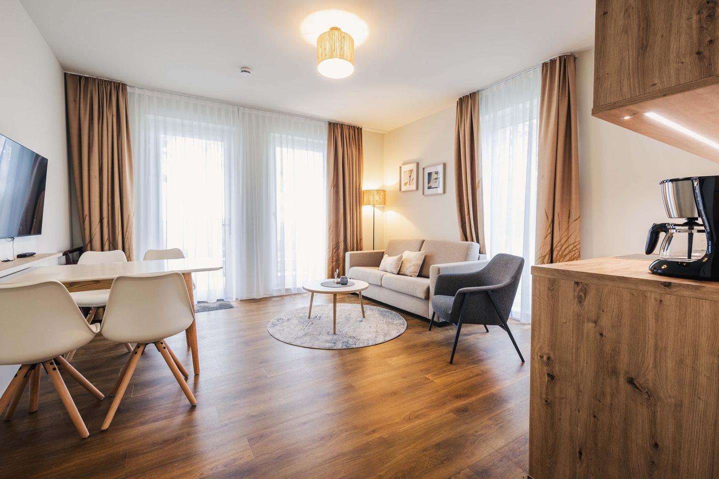 Das Appartement bietet auf 44 qm genügend Platz für bis zu 4 Personen. Genießen Sie Ihren Traumurlaub am Bodstedter Bodden im Baltic Lagoon Resort in Fuhlendorf und fühlen Sie sich wie Zuhause. Restaurant und Strand befinden sich direkt im Resort.