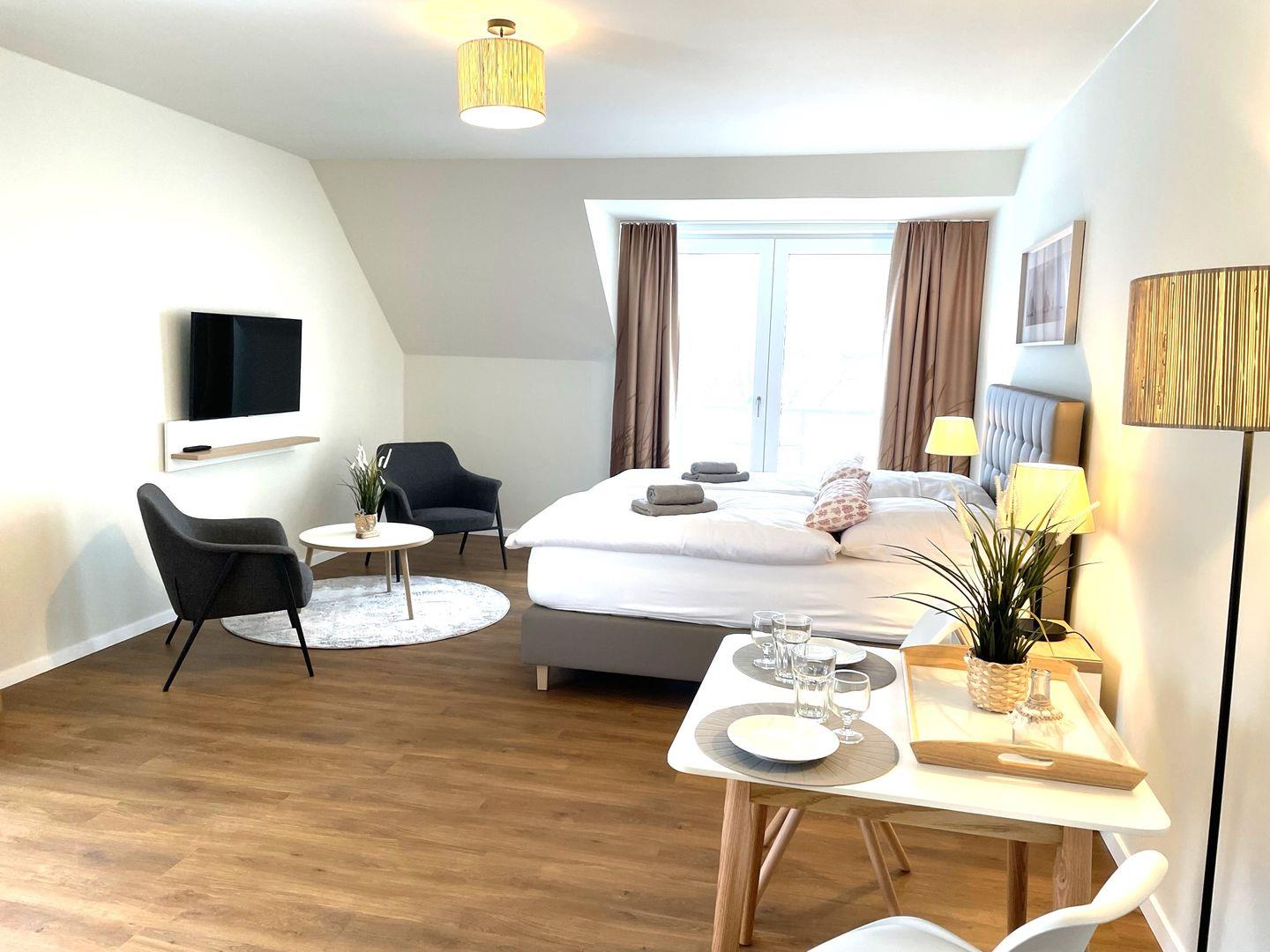 Das komfortable Appartement bietet auf 40 qm Platz für bis zu 2 Personen. Der gemütliche Wohn- und Schlafbereich besitzt ein modernes Doppelbett (1,80m x 2,00m), auf welchem Sie Ihre Erholung finden werden. Zu Ihrem Entertainment dient ein moderner Flatscreen-TV. Ein Kinderbett sowie ein Hochstuhl können auf Anfrage hinzugebucht werden.