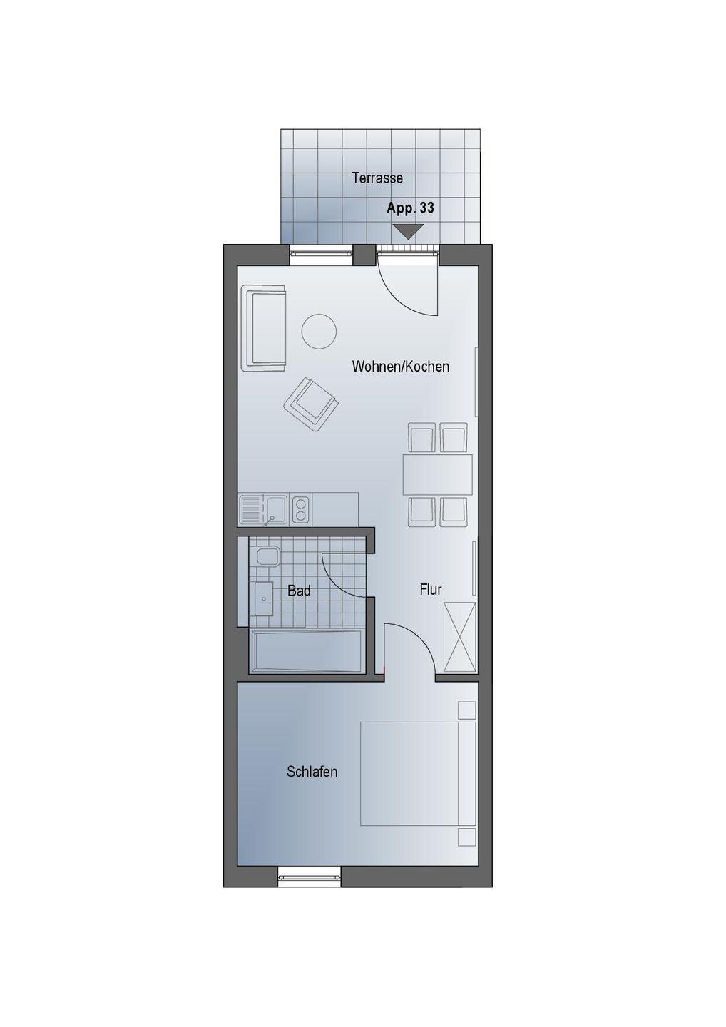 Auf der Terrasse stehen Ihnen moderne Terrassenmöbel zur Verfügung, sodass Sie beispielweise Ihr Frühstück oder Ihr Abendessen ganz privat im Sonnenschein zu sich nehmen können.