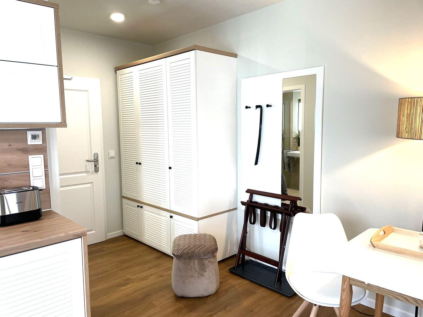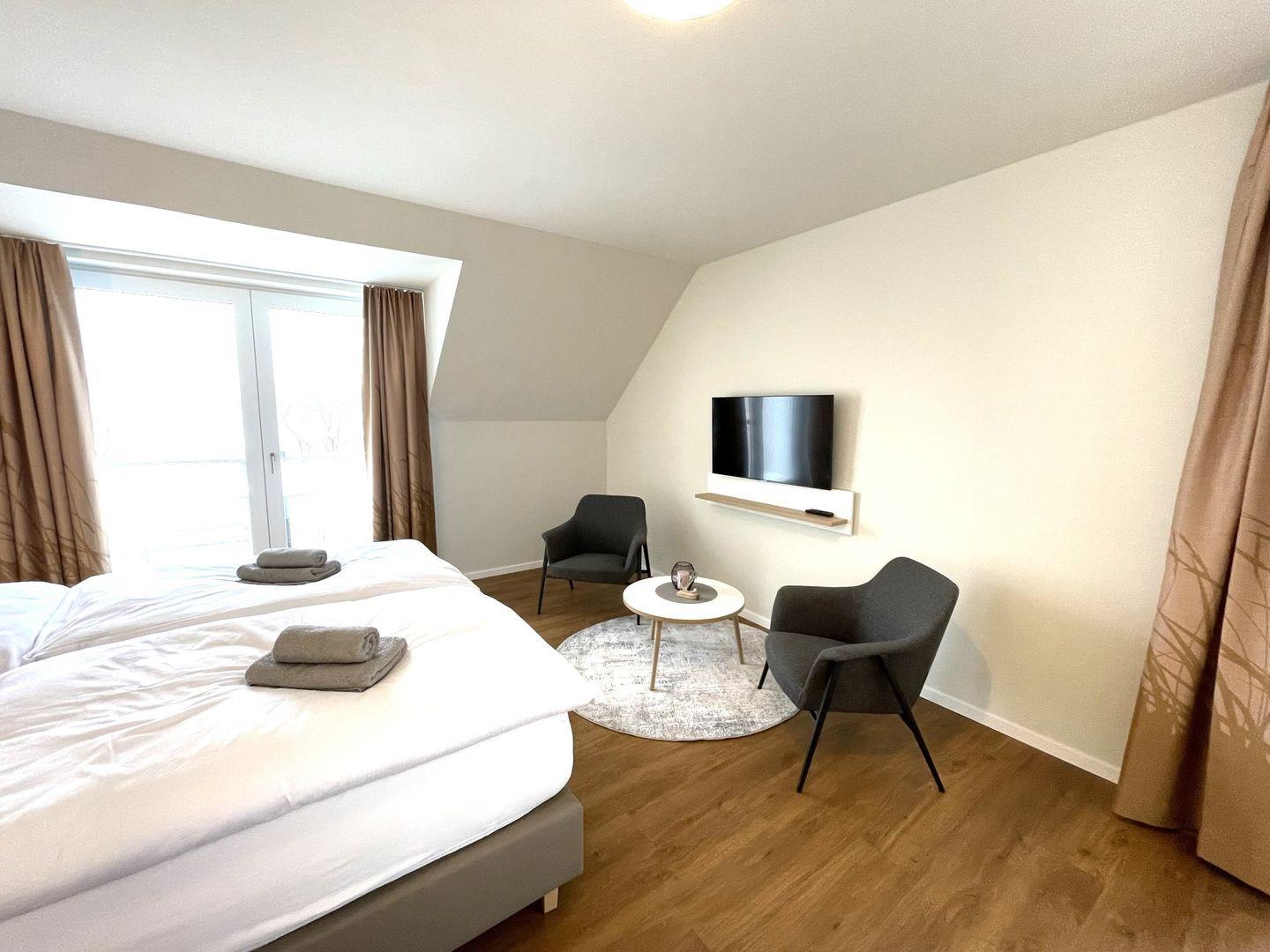 Das komfortable Appartement bietet auf 40 qm Platz für bis zu 2 Personen. Der gemütliche Wohn- und Schlafbereich besitzt ein modernes Doppelbett (1,80m x 2,00m), auf welchem Sie Ihre Erholung finden werden. Zu Ihrem Entertainment dient ein moderner Flatscreen-TV. Ein Kinderbett sowie ein Hochstuhl können auf Anfrage hinzugebucht werden.