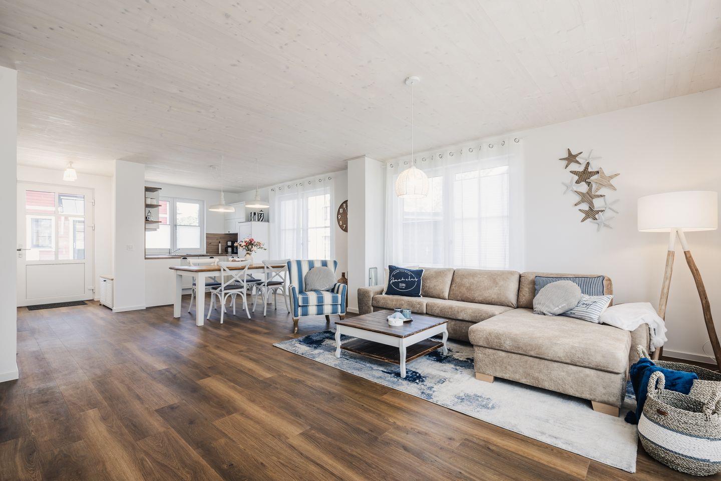Das gemütliche Ferienhaus bietet auf ca. 100 qm viel Platz für bis zu 4 Personen. Der komfortable Wohnbereich besitzt ein bequemes Sofa und sorgt mit einem Flat Screen-TV für Entertainment.