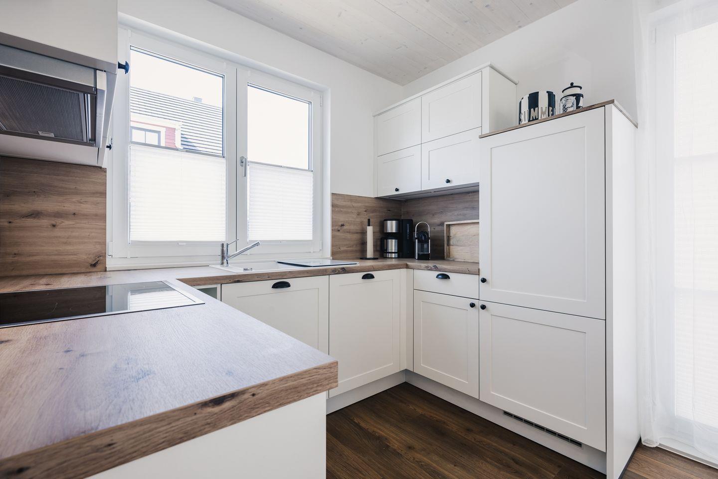 Die offene Küchenzeile mit anliegendem Essbereich ist mit einen Geschirrspüler, Mikrowelle, Kühlschrank mit Gefrierfach, Kaffeemaschine, 4-Platten-Ceranfeld, Backofen und Wasserkocher ausgestattet. Natürlich finden Sie hier auch Geschirr und Besteck sowie weitere Küchengeräte und Utensilien.