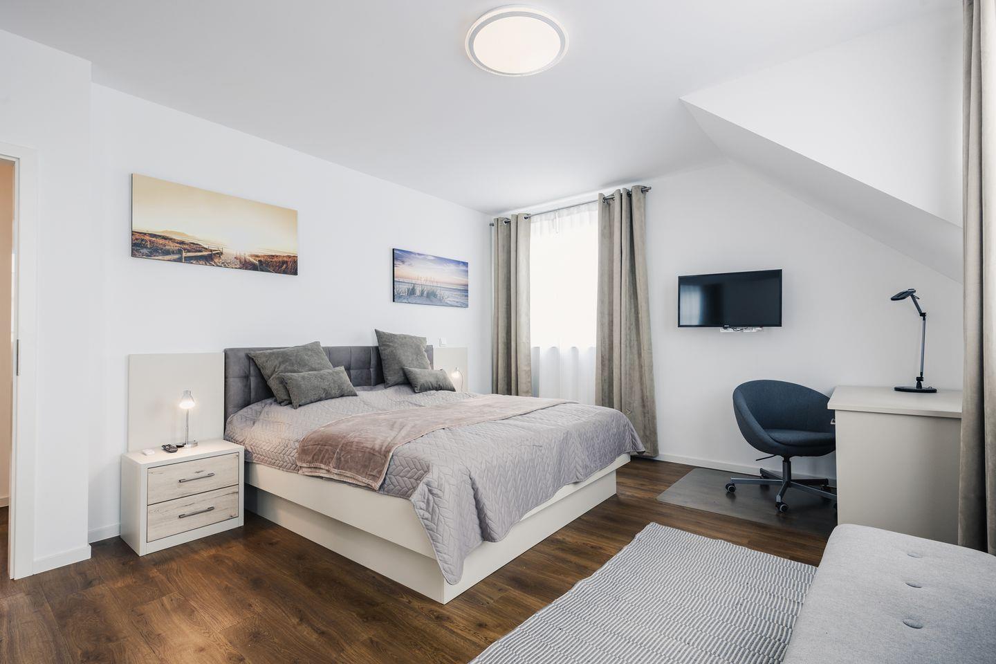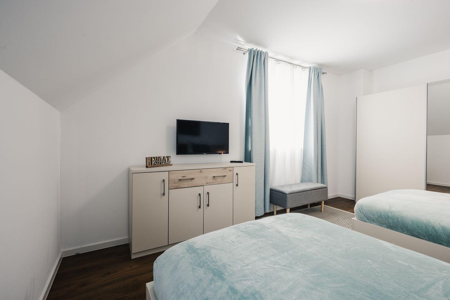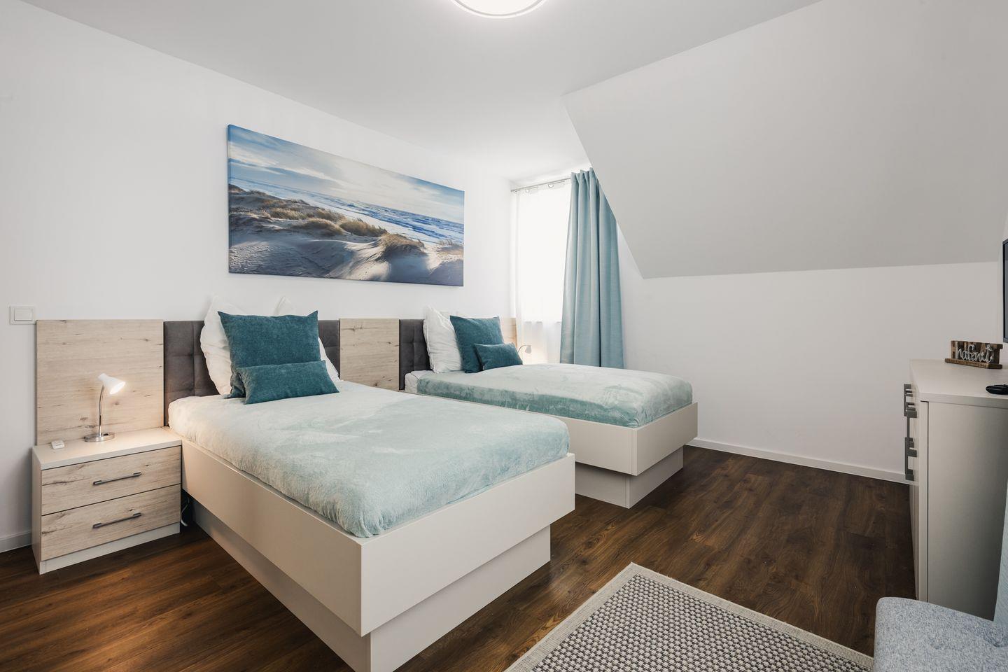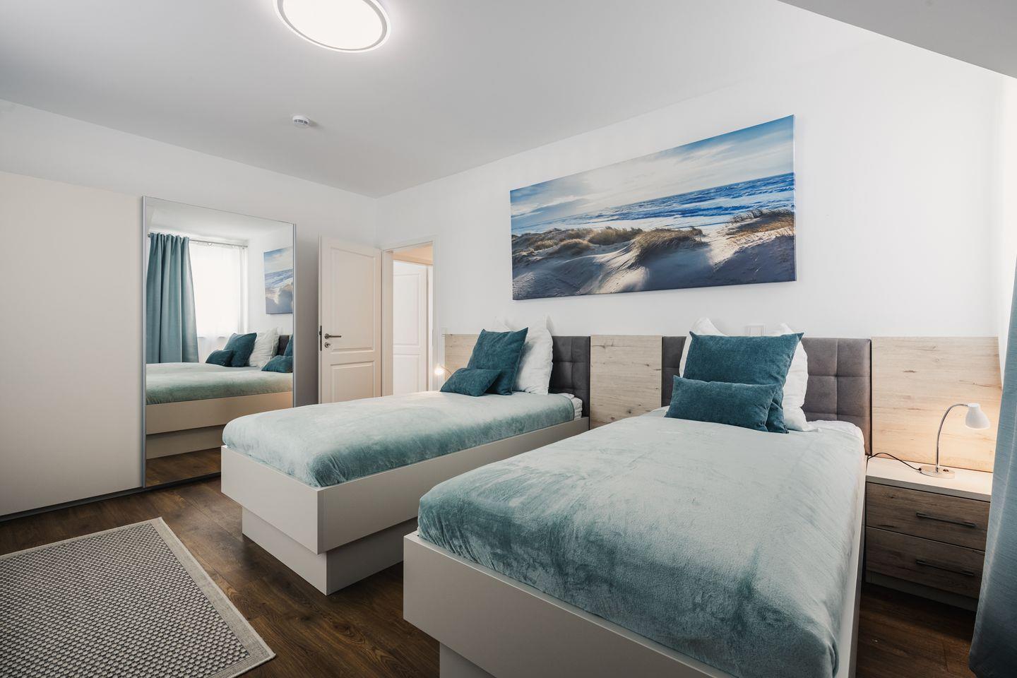 Die beiden Schlafzimmer bieten Ihnen ein modernes Doppelbett (1,80m x 2,00m), sowie zwei Einzelbetten (0,90m x 2,00m) auf welchem Sie Erholung und Entspannung finden. Ein Kinderbett sowie ein Hochstuhl sind im Haus vorhanden.