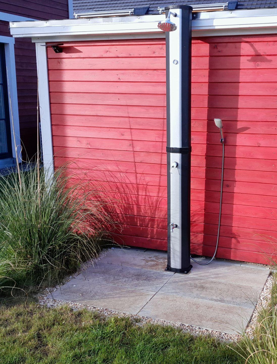 Auf der Terrasse stehen Ihnen moderne Terrassenmöbel zur Verfügung, sodass Sie beispielweise Ihr Frühstück oder Ihr Abendessen ganz privat im Sonnenschein zu sich nehmen können. Das Ferienhaus ist mit einer Außendusche ausgestattet.