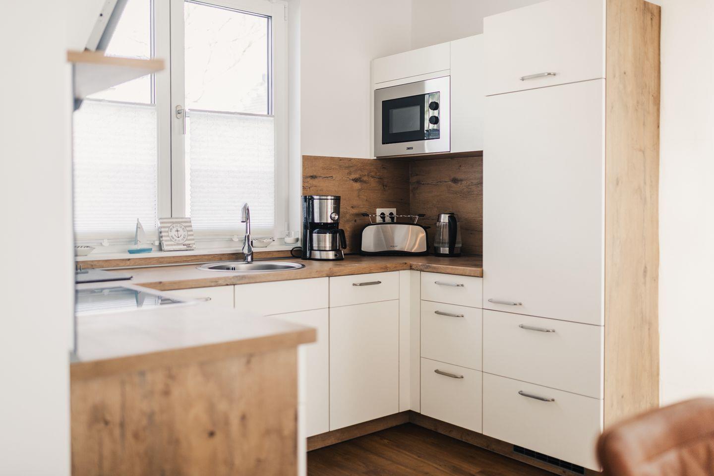 Die offene Küchenzeile mit anliegendem Essbereich ist mit einen Geschirrspüler, Kühlschrank mit Gefrierfach, Kaffeemaschine, 4-Platten-Ceranfeld und Wasserkocher ausgestattet. Natürlich finden Sie hier auch Geschirr und Besteck sowie weitere Küchengeräte und Utensilien.