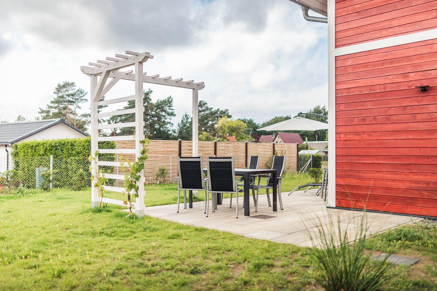 Gemütliches Ferienhaus Baltic Lagoon 16b am Bodstedter Bodden mit Terrasse, direktem Strandzugang und moderner Ausstattung für erholsamen Urlaub.