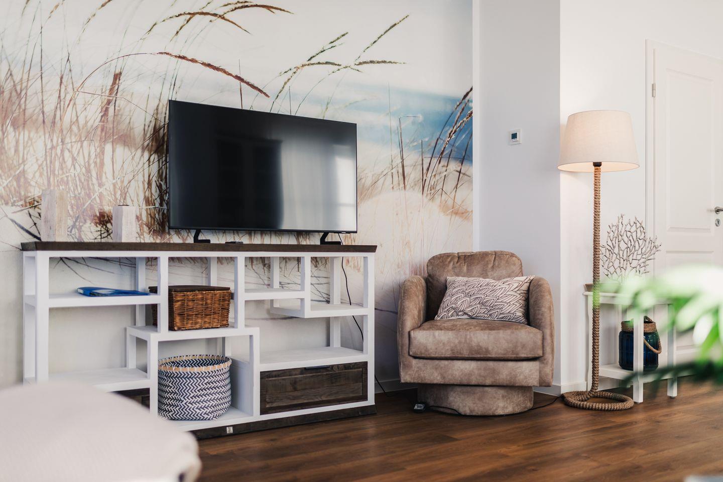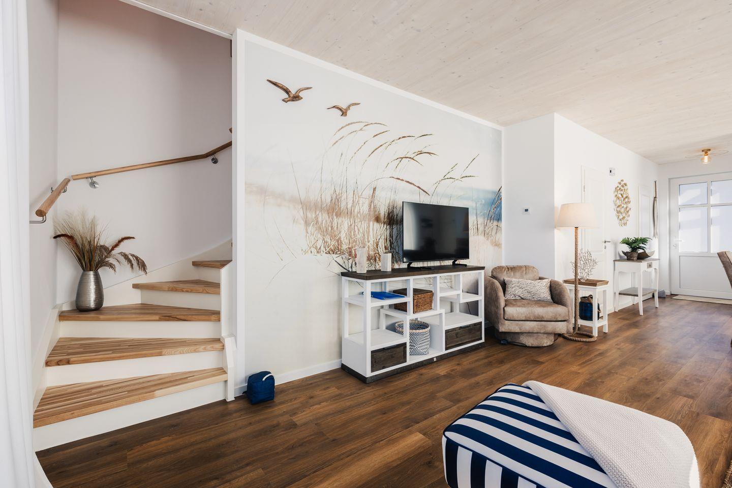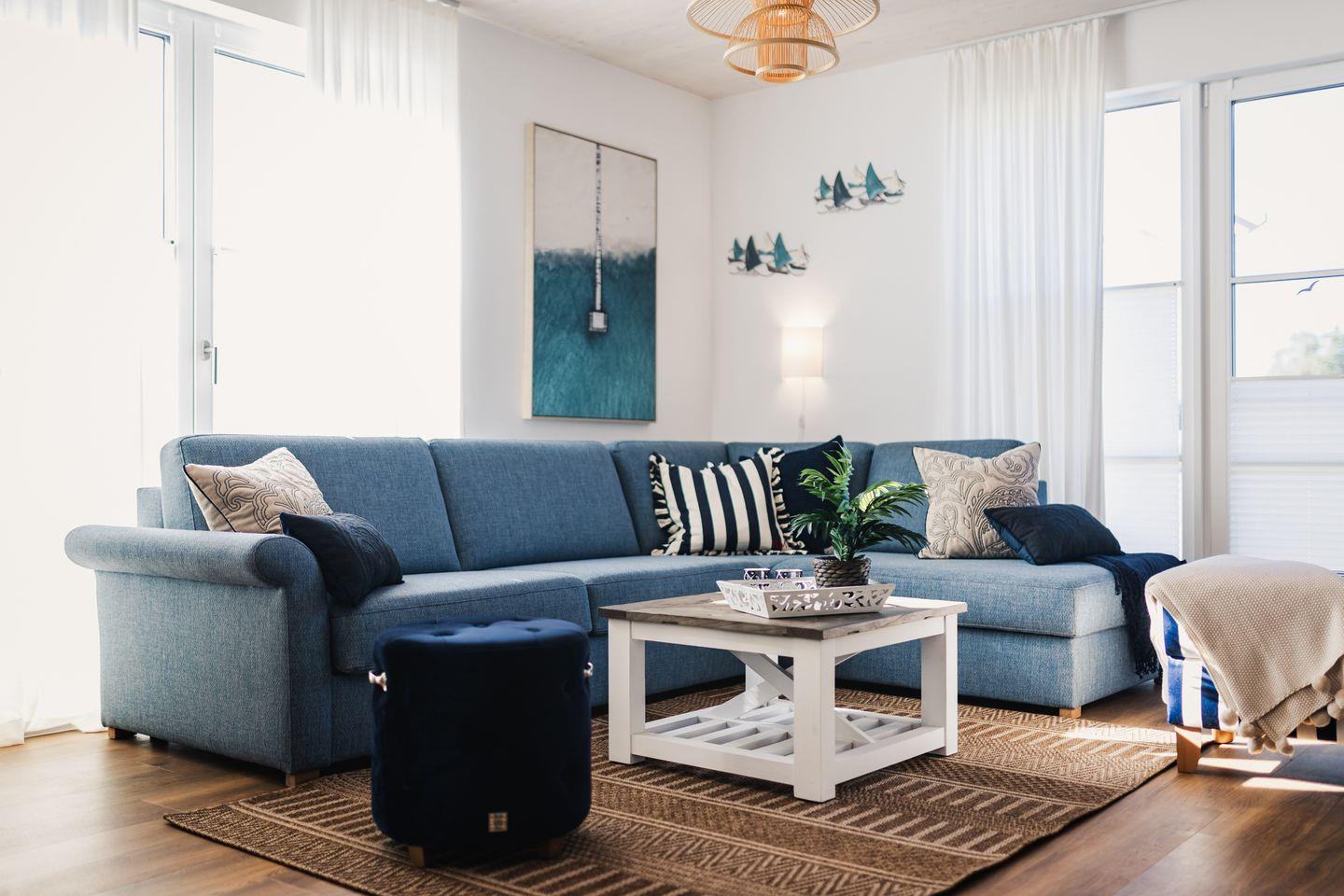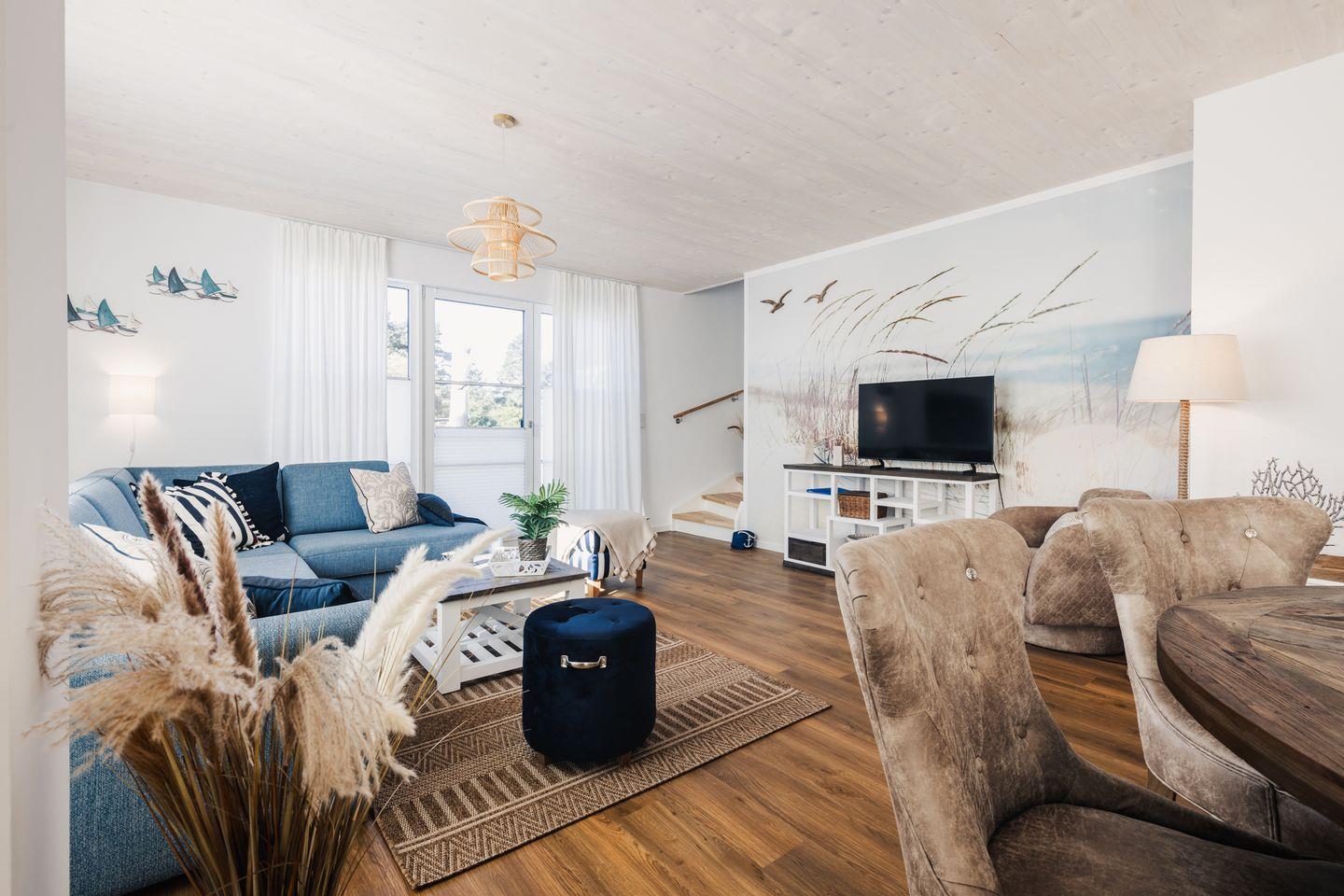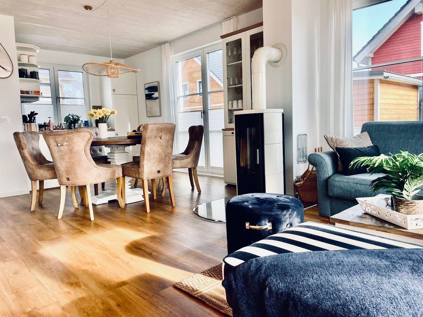 Das gemütliche Ferienhaus bietet auf ca. 100 qm viel Platz für bis zu 6 Personen. Der komfortable Wohnbereich besitzt ein bequemes Doppel-Schlafsofa(1,70 x 2,00m) mit Kuscheldecke und sorgt mit einem Flat Screen-TV für Entertainment.