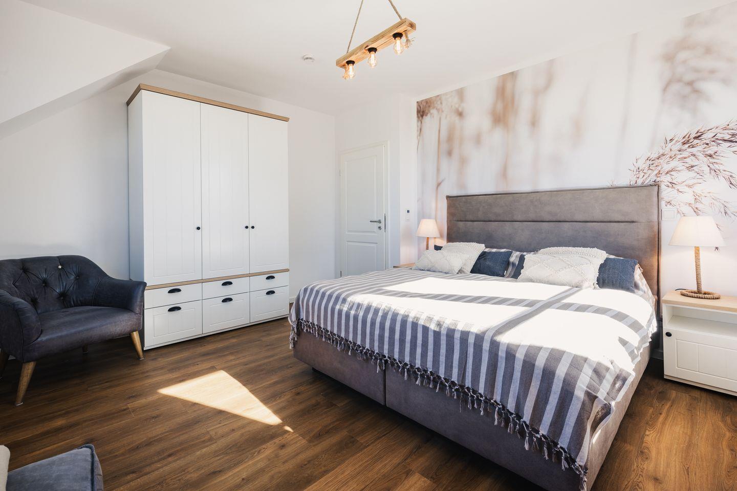 Die beiden Schlafzimmer bieten Ihnen jeweils ein modernes Doppelbett (1,80m x 2,00m), auf welchem Sie Erholung und Entspannung finden. Ein Kinderbett sowie ein Hochstuhl stehen Ihnen im Haus kostenfrei zur Verfügung.