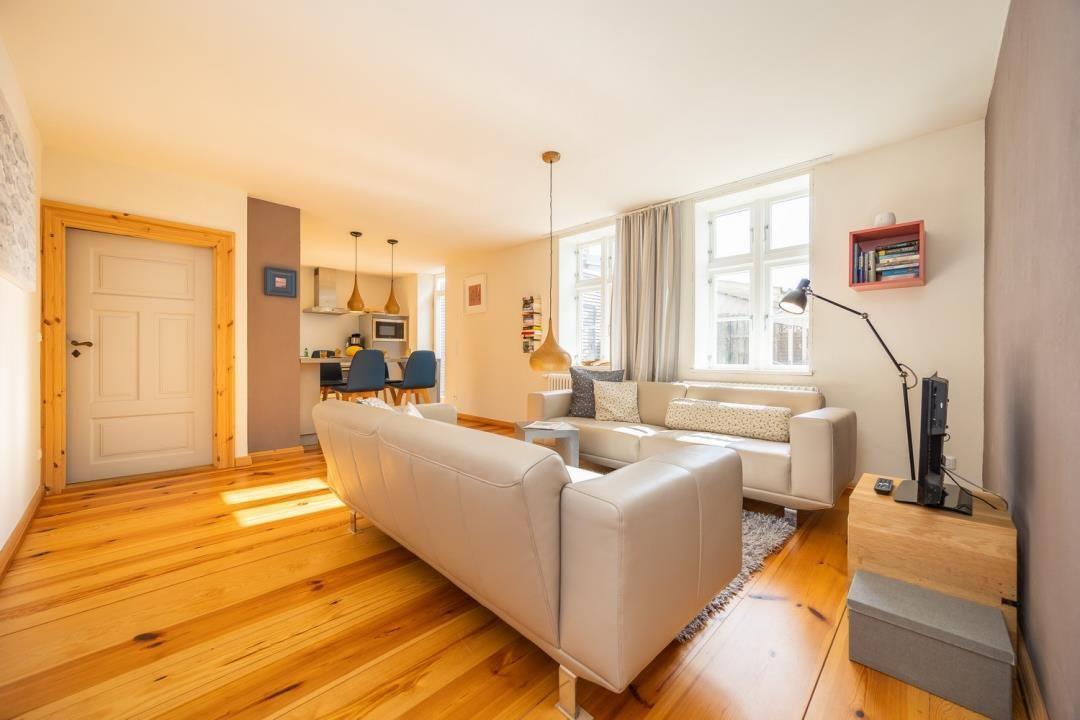 Die Ferienwohnung "HAFEN EINS" befindet sich im Erdgeschoss eines unter Denkmalschutz stehenden Hauses, in dem ehemals Boote u.a. für den Fischfang gebaut wurden. Damit erklären sich die etwas niedrigeren Türrahmen und auch der reizvolle Blick
