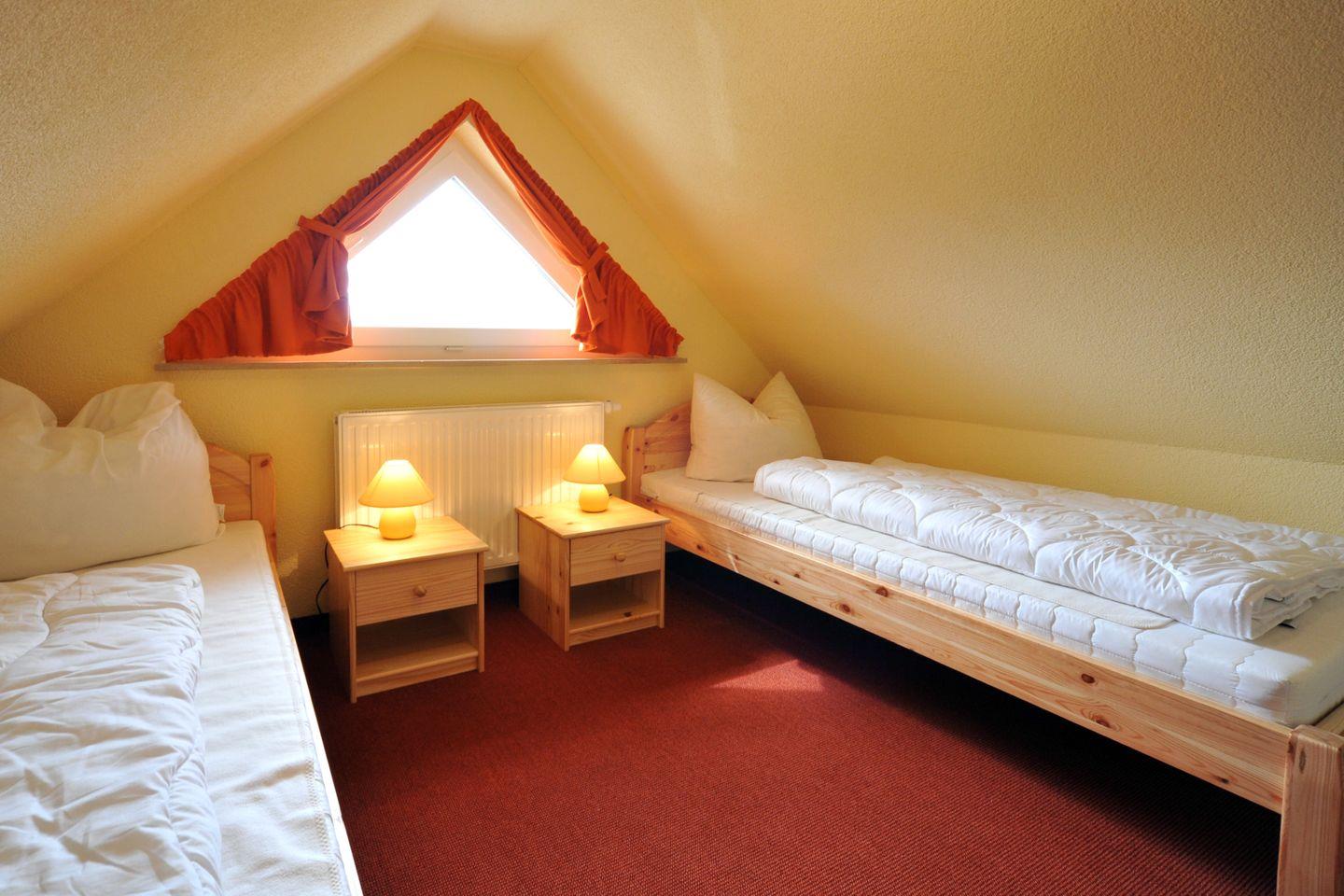 Das Dachgeschoss bietet ein weiteres Schlafzimmer mit zwei Einzelbetten – ideal für Familien mit mehreren Kindern oder Gruppen.