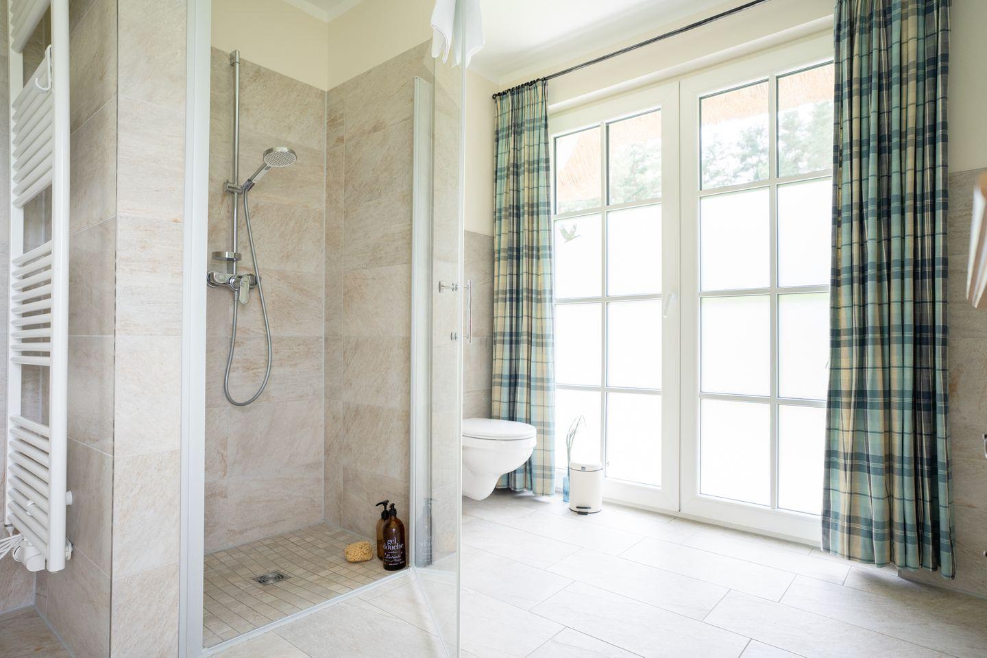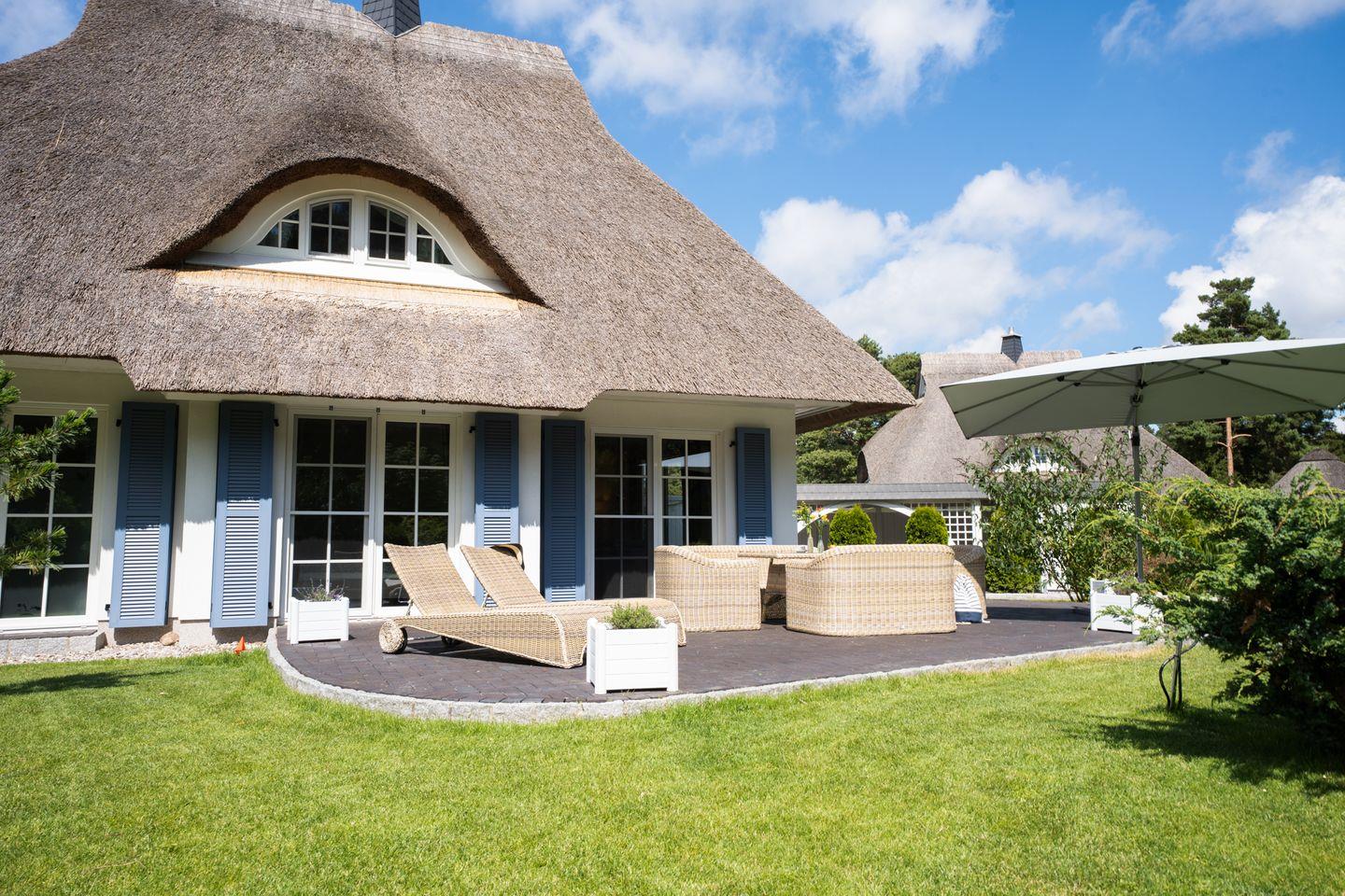 Dieses wunderschöne Ferienhaus mit traditionellem Reetdach, Fensterläden, ortstypischer Feldsteineinfriedung und großem, eingezäuntem Grundstück liegt in einer neuen Ferienhausanlage. Es bietet großzügig Platz für sechs Feriengäste (drei Schlafzimmer mit Doppelbett, davon eins im EG) und verfügt über zwei hochwertige Bäder und ein Gäste-WC, davon ein Bad im Erdgeschoss mit Dusche, ein Bad im Obergeschoss mit Dusche und Sauna.