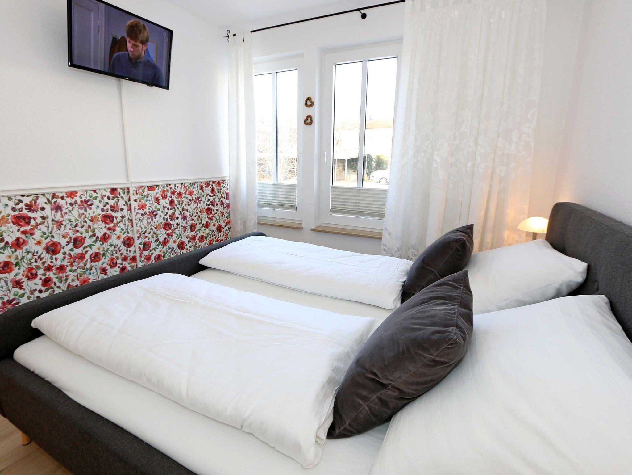 Die Nichtraucherferienwohnung des Hauses Eintracht ist eine komfortable 2-Raumwohnung in der 1. Etage und umfasst etwa 56m², somit bietet sie Platz für bis zu 4 Personen. Sie setzt sich zusammen aus einem Wohnzimmer mit Zugang zum Balkon, einem Schlafzimmer, einer Küchenzeile, einem Flur und einem Badezimmer. Der Wohnbereich ist liebevoll und detailreich eingerichtet. In dem lichtdurchfluteten Raum finden sie, neben zwei Sessel, einen Couchtisch, eine Schlafcouch (1,60m x 2,00m), welches als Schlafmöglichkeit für 2 Personen geeignet ist. Ein Smart-TV sowie ein DVD-Player ermöglichen es ihnen, nach einem eindrucksvollen Tag einen gemütlichen Filmabend mit den Liebsten zu verbringen. Auch ein Radio mit CD-Player und verschiedene Lektüren für die Bücherwürmer unter Ihnen sind vorzufinden. Auf einen Internetzugang (WLAN) brauchen Sie nicht zu verzichten. Des Weiteren befindet sich hier auch ein schöner Esstisch mit vier bequemen Stühlen, die sich direkt am Balkon Fenster befinden. Auf diesem zu Süd gerichteten Balkon befindet sich ein Tisch mit vier Stühlen, einen Sonnenschirm sowie einer Gartenbank. Die neu moderne Küchenzeile ist ausgestattet mit einem Ceranfeld, Backofen und einem Kühlschrank mit Eisfach, Geschirrspüler, Mikrowelle, Wasserkocher, Toaster, Kaffeemaschine und diverse Kochutensilien. Das Schlafzimmer ist mit einem Doppelbett (1,80m x 2,00m), verstellbare Lattenroste, Nachttischablagen und einem geräumigen Kleiderschrank ausgestattet. Wie im Wohnzimmer ist das Schlafzimmer angenehm hell, auch hier befindet sich ein TV-Gerät. Bei Bedarf können sie jedoch einfach die Raffrollos zuziehen und dunkeln den Raum somit komplett ab. Sollten sie feststellen, dass ihre Kleidung im Koffer zerknittert ist, so finden sie im Schlafzimmer sowohl ein kleines Bügelbrett als auch ein Bügeleisen vor. Das Badezimmer setzt sich zusammen aus einer modernen Regendusche, einem großen Waschtisch mit einem geräumigen Unterschrank, einem WC, einem großen beleuchteten Spiegel sowie einem Handtuchheizkörper. Auch ein Fön steht Ihnen zur Verfügung. Natürlich ist auch an die kleinen Gäste gedacht, so dass Sie sich an verschiedenen Spielzeuge, Gesellschaftsspielen und Kinderbüchern erfreuen können. Ihr PKW-Stellplatz (Nr.16) befindet sich direkt am Haus. Zu der Villa ?Eintracht? gehört auch ein kleiner Kinderspielplatz. Leider sind bei uns keine Haustiere erlaubt. Die Erstausstattung eines Wäschepaketes (komplette Bettwäsche, 1 Duschhandtuch, 2 kleine Handtücher, 2 Geschirrhandtücher) können Sie bis 14 Tage vor Anreise gegen einen Aufpreis dazu buchen oder durch eigene ergänzen.