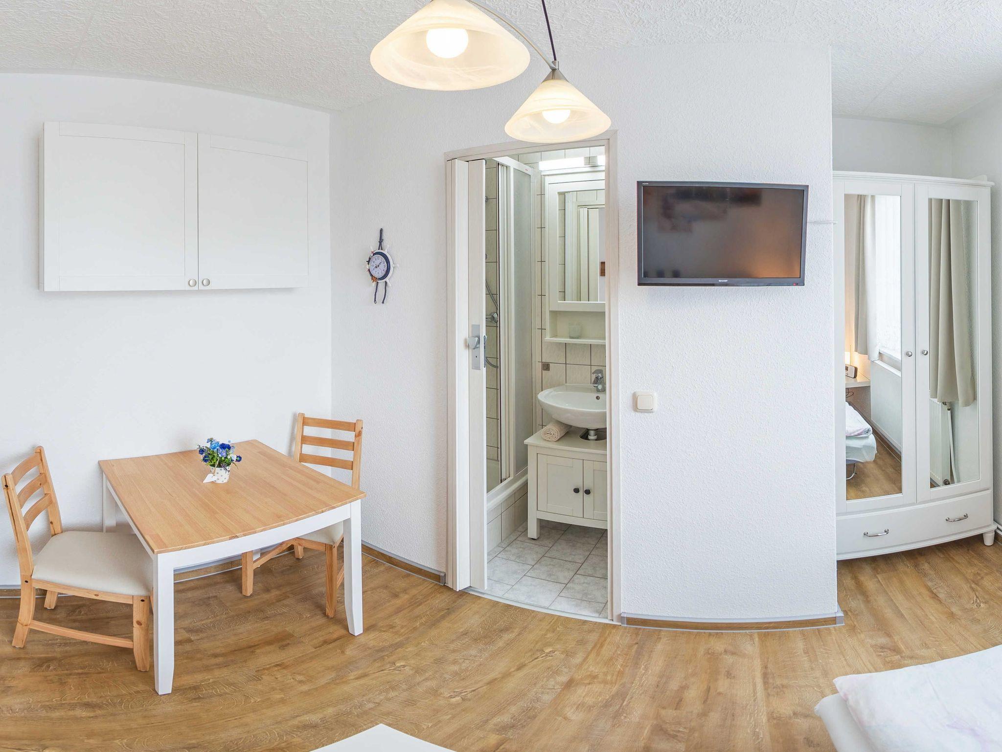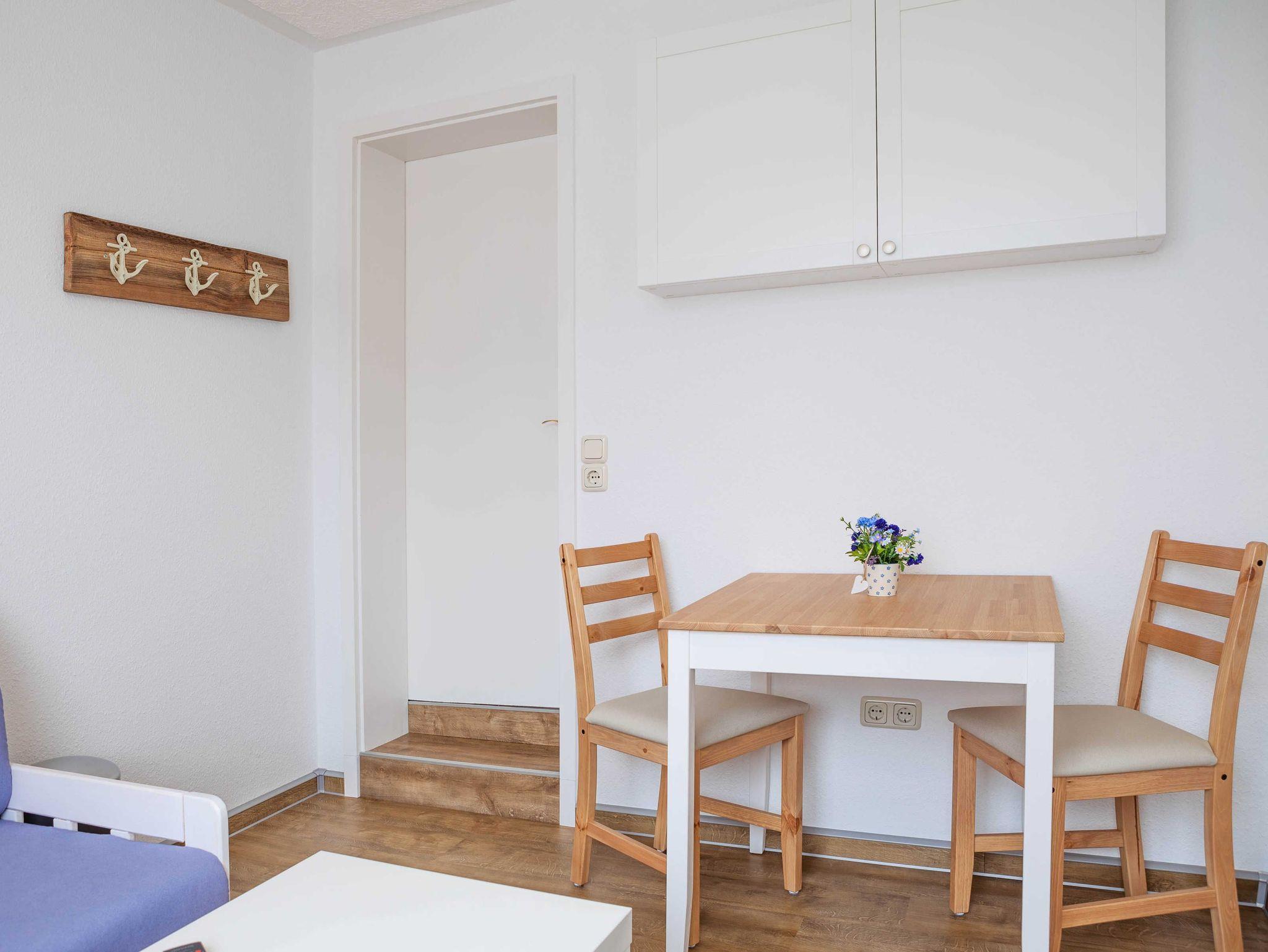 Das 12m² große Ferienzimmer befindet sich im Einfamilienhaus des Vermieters und wird über einen gemeinsamen Flur betreten. Es besteht aus einem Wohn- und Schlafraum mit einer Schlafcouch, Kleiderschrank, TV und einem kleinen Essbereich mit Wasserkocher, Kaffeemaschine und Toaster. Auf dem Flur befindet sich ein kleiner Kühlschrank, welcher von Gästen des Ferienzimmers mitgenutzt werden kann.