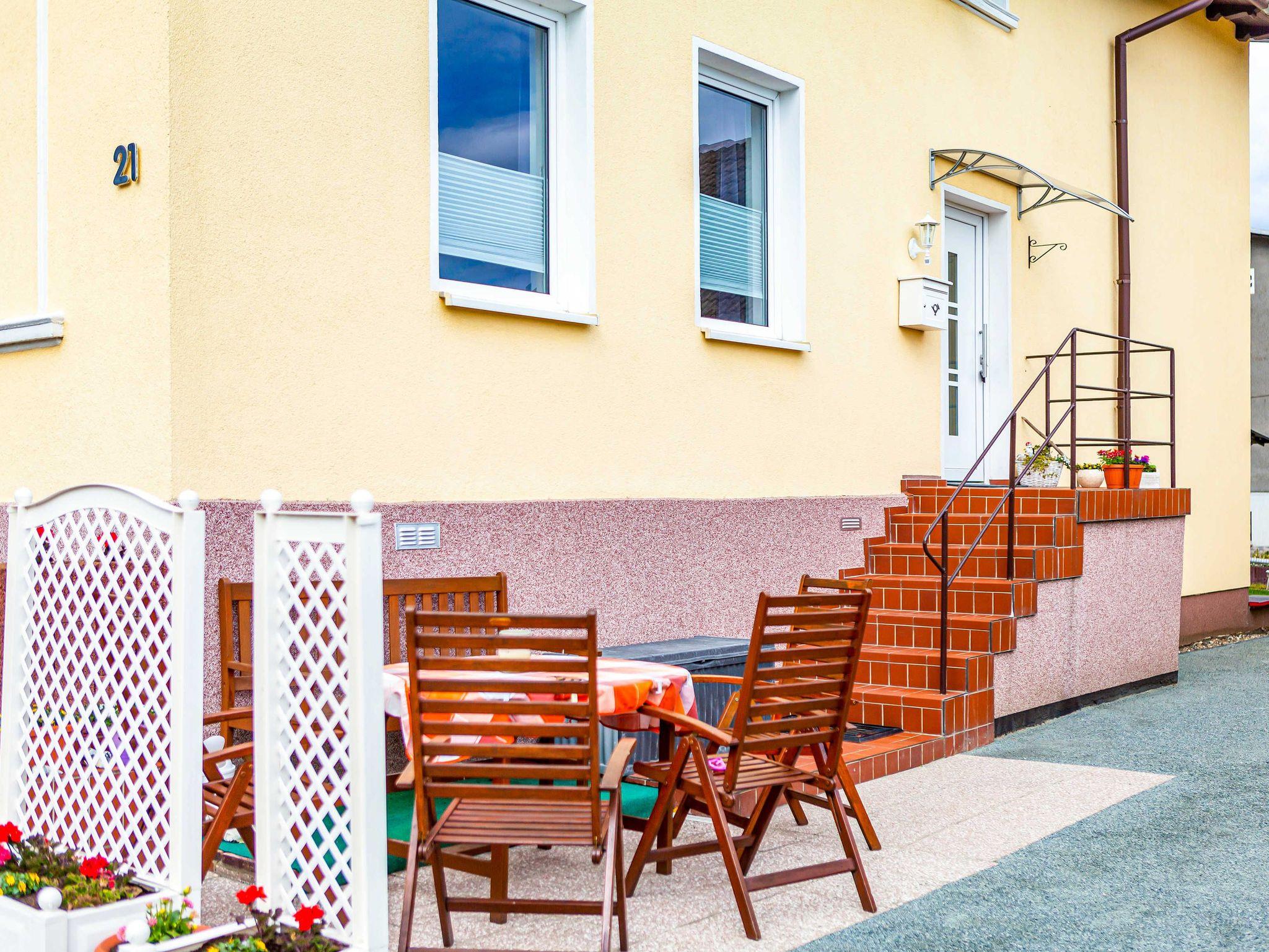 Vor dem Haus befindet sich eine kleine Terrasse mit Gartenmöbeln und ein Fahrradständer.