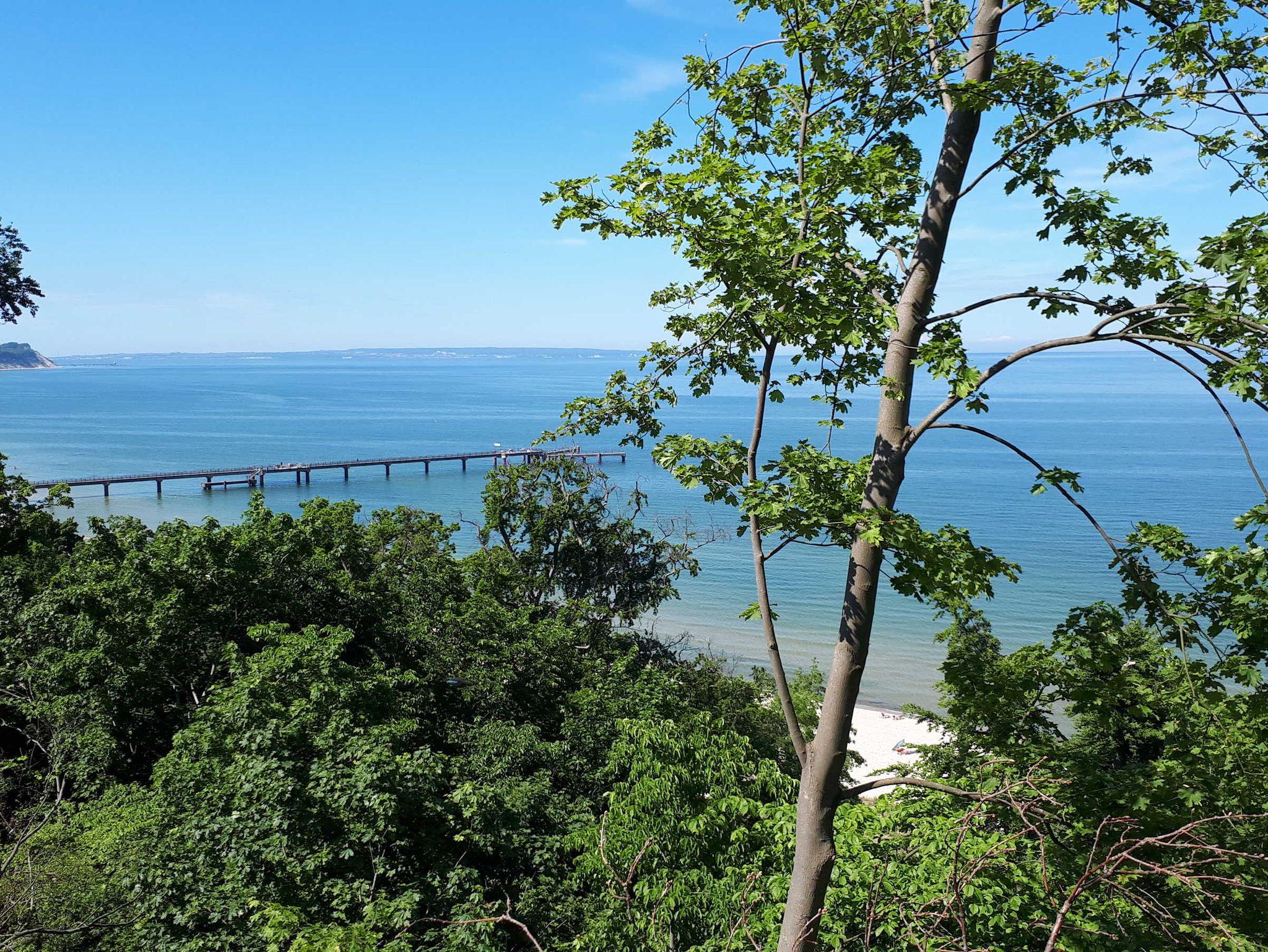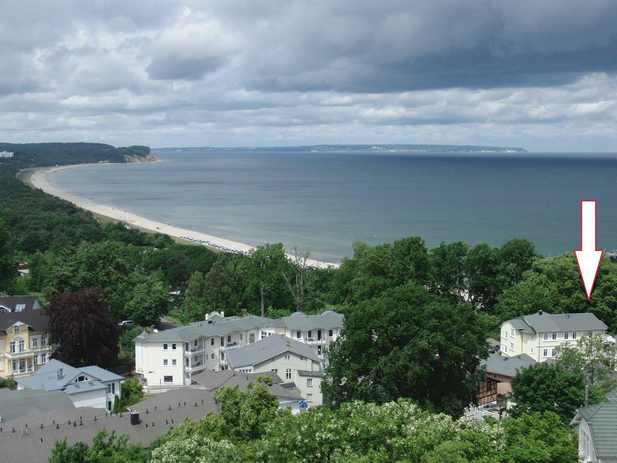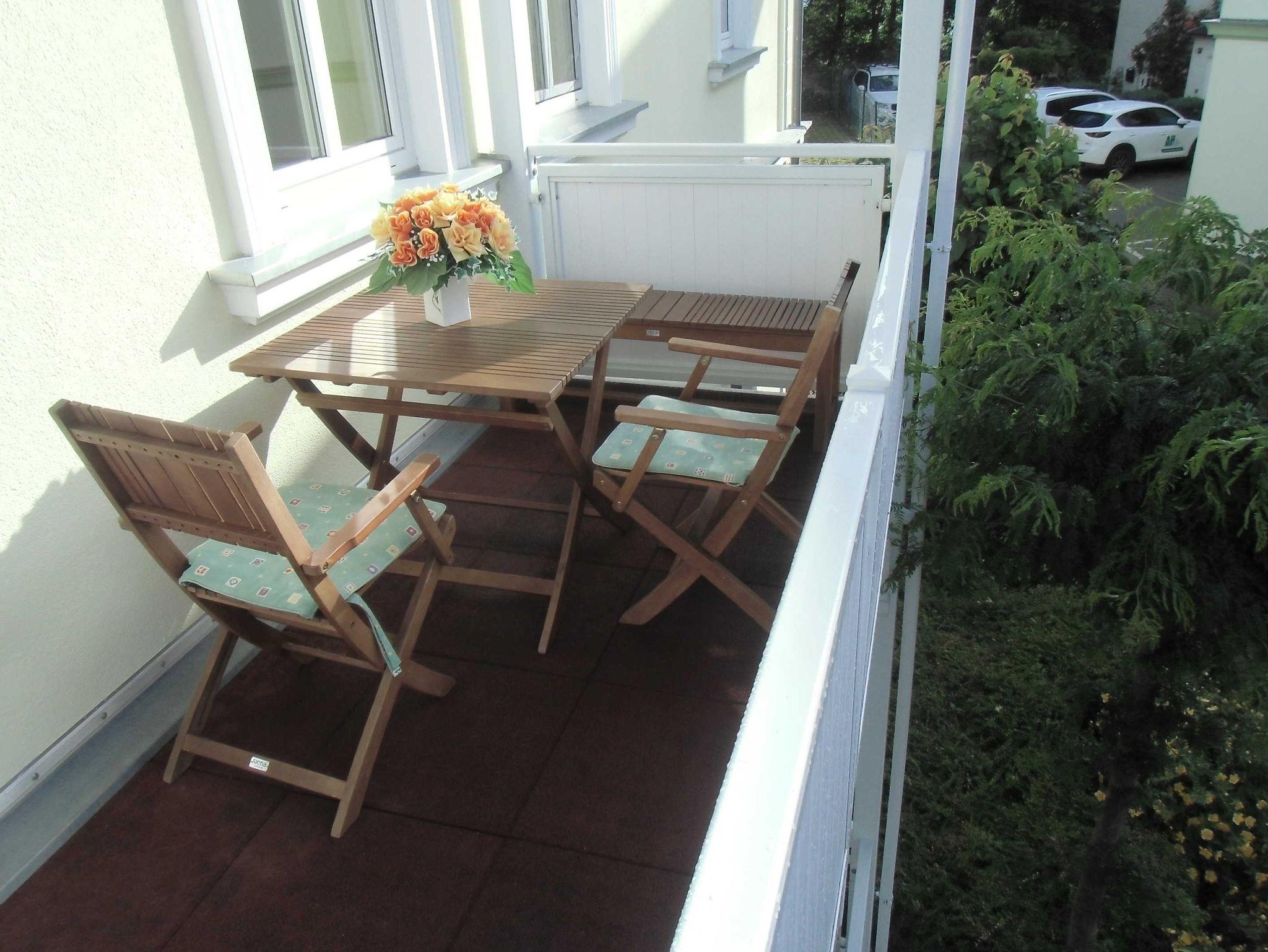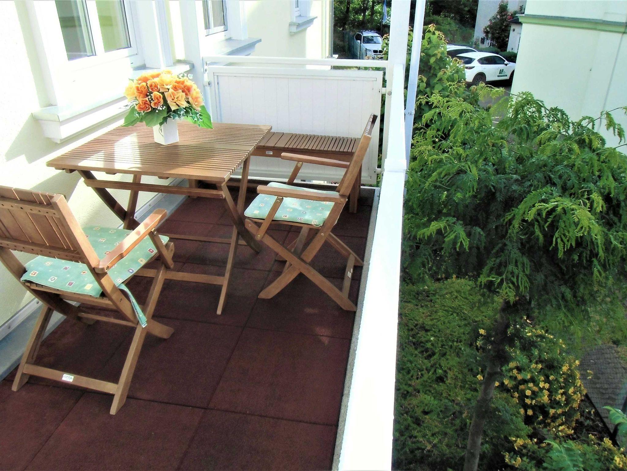 Die 40 qm große 2- Raumwohnung befindet sich in der 1. Etage. Der große Wohnraum beinhaltet eine vollausgestatte Küchenzeile mit Geschirrspüler, Backofen, Kühlschrank, Microwelle, Toaster, Kaffeemaschine, kompletten Geschirr und diversen Küchenutensilien. Ein bequemes Sofa (mit Schlaffunktion 1,20 m x 2,00 m), eine Essecke für 4 Personen und ein Flachbild-TV, kostenfreies WLAN, Bücher und Gesellschaftsspiele bieten alles,was einen gemütlichen Aufenthalt garaniert. Vom Wohnraum gelangt man auf den großzügigen separaten Südost-Balkon, wo kein Nachbar stört. Nach dem Blätterfall, im Winter ist ein seitlicher Meerblick möglich.