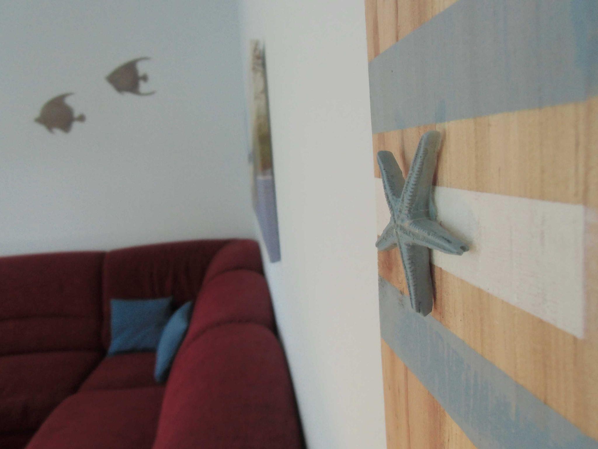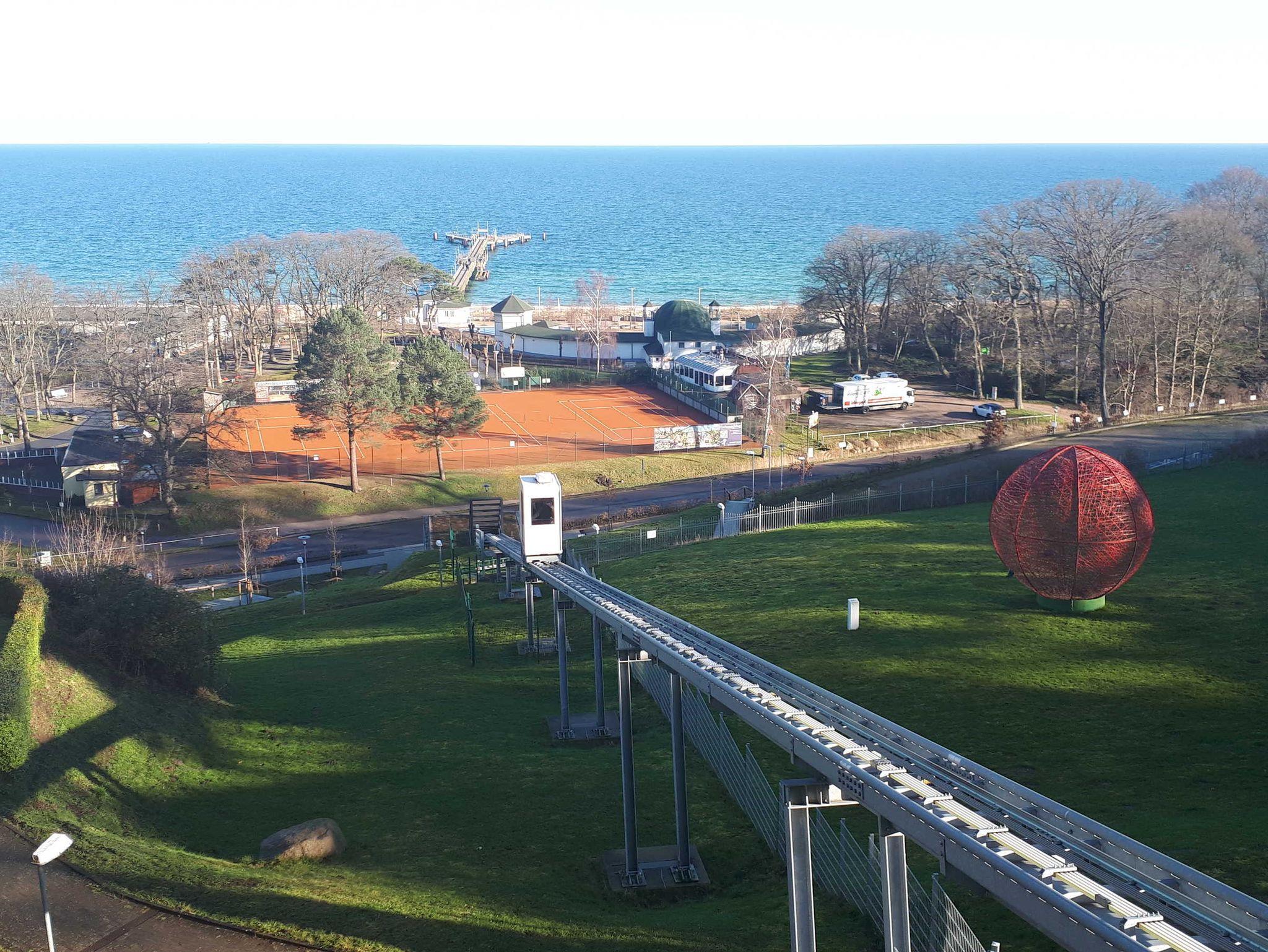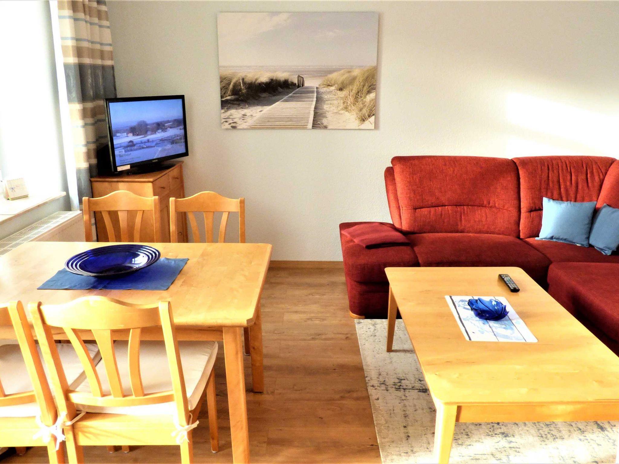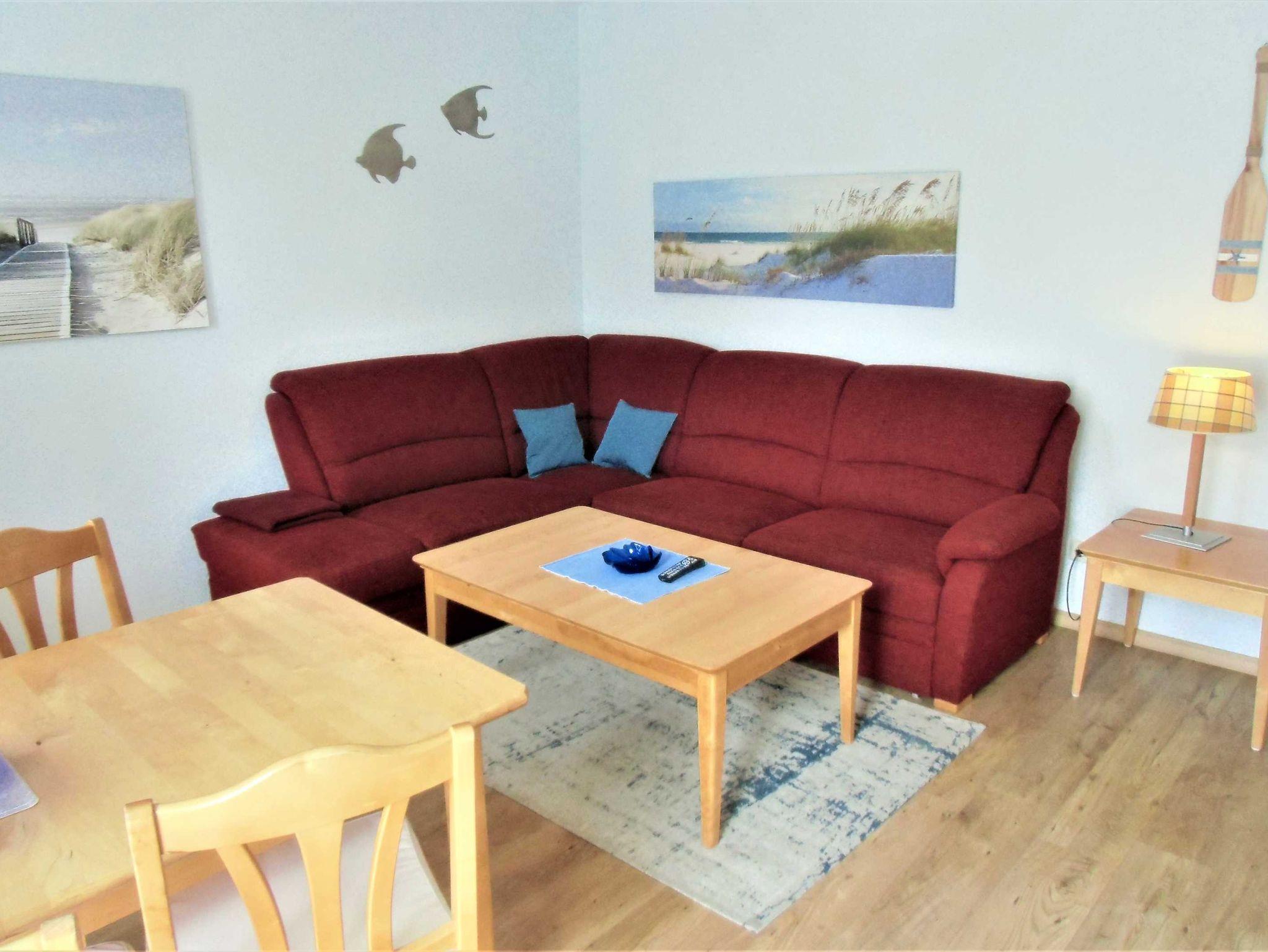 Die 40 qm große 2- Raumwohnung befindet sich in der 1. Etage. Der große Wohnraum beinhaltet eine vollausgestatte Küchenzeile mit Geschirrspüler, Backofen, Kühlschrank, Microwelle, Toaster, Kaffeemaschine, kompletten Geschirr und diversen Küchenutensilien. Ein bequemes Sofa (mit Schlaffunktion 1,20 m x 2,00 m), eine Essecke für 4 Personen und ein Flachbild-TV, kostenfreies WLAN, Bücher und Gesellschaftsspiele bieten alles,was einen gemütlichen Aufenthalt garaniert. Vom Wohnraum gelangt man auf den großzügigen separaten Südost-Balkon, wo kein Nachbar stört. Nach dem Blätterfall, im Winter ist ein seitlicher Meerblick möglich.