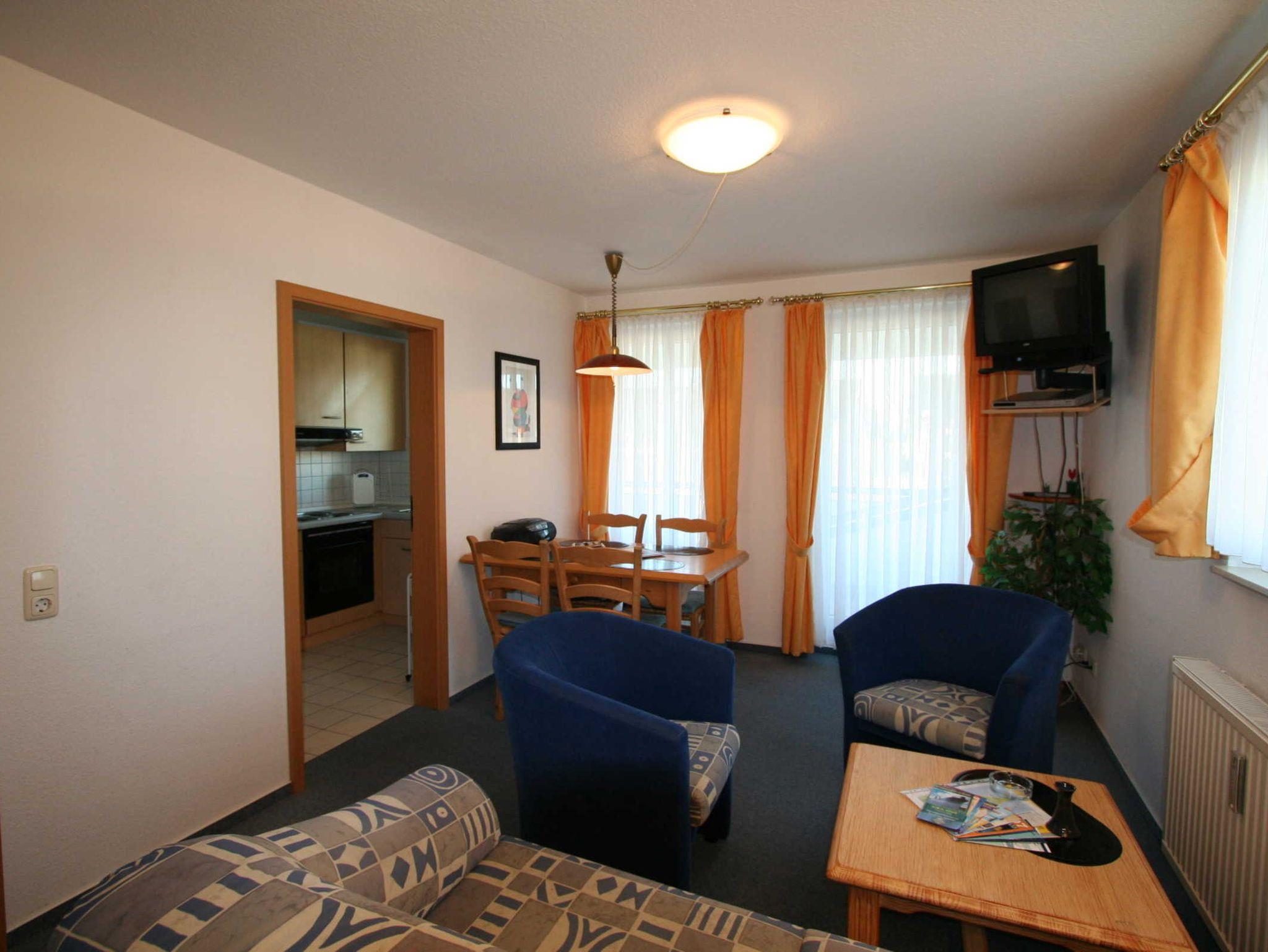 Sie wohnen in einem 2-Zimmer-Appartement für bis zu 4 Personen auf 42 m² Wohnfläche im Dachgeschoss. Ein Schlafzimmer mit Doppelbett, Wohn-/Schlafraum mit bequemer Doppelbettcouch, separater Essplatz, voll ausgestatteter Küchenzeile mit Geschirrspüler und Mikrowelle, Dusche/WC/Föhn und Waschmaschine, Balkon, Elektrogrill, SAT-Farb-TV, DVD-Player. Aussenstellplatz für PKW. Zwei Fahrräder stehen zur Verfügung.