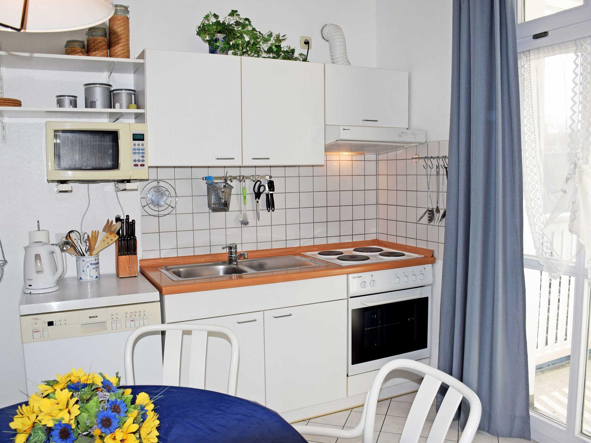 In der Küche gibt es einen 4 Plattenherd mit Backofen, Kühlschrank mit Kühlfach, Geschirrspülmaschine, Kaffeemaschine, Mikrowelle etc. Aus der Küche gelangt man auf den überdachten Südbalkon mit Blick zum Ort, ebenfalls mit Tisch und Stühlen zum Verweilen in der Sonne.