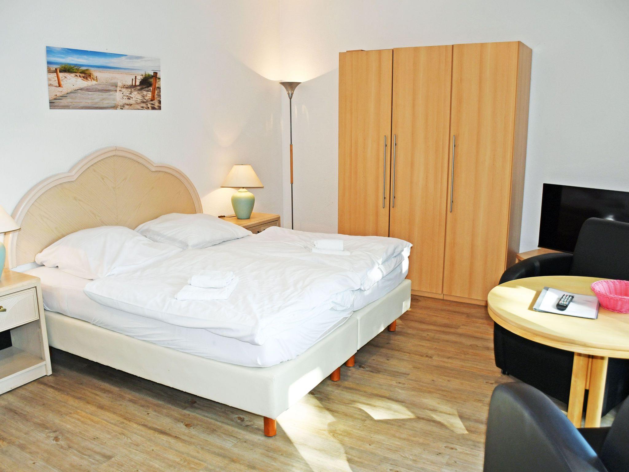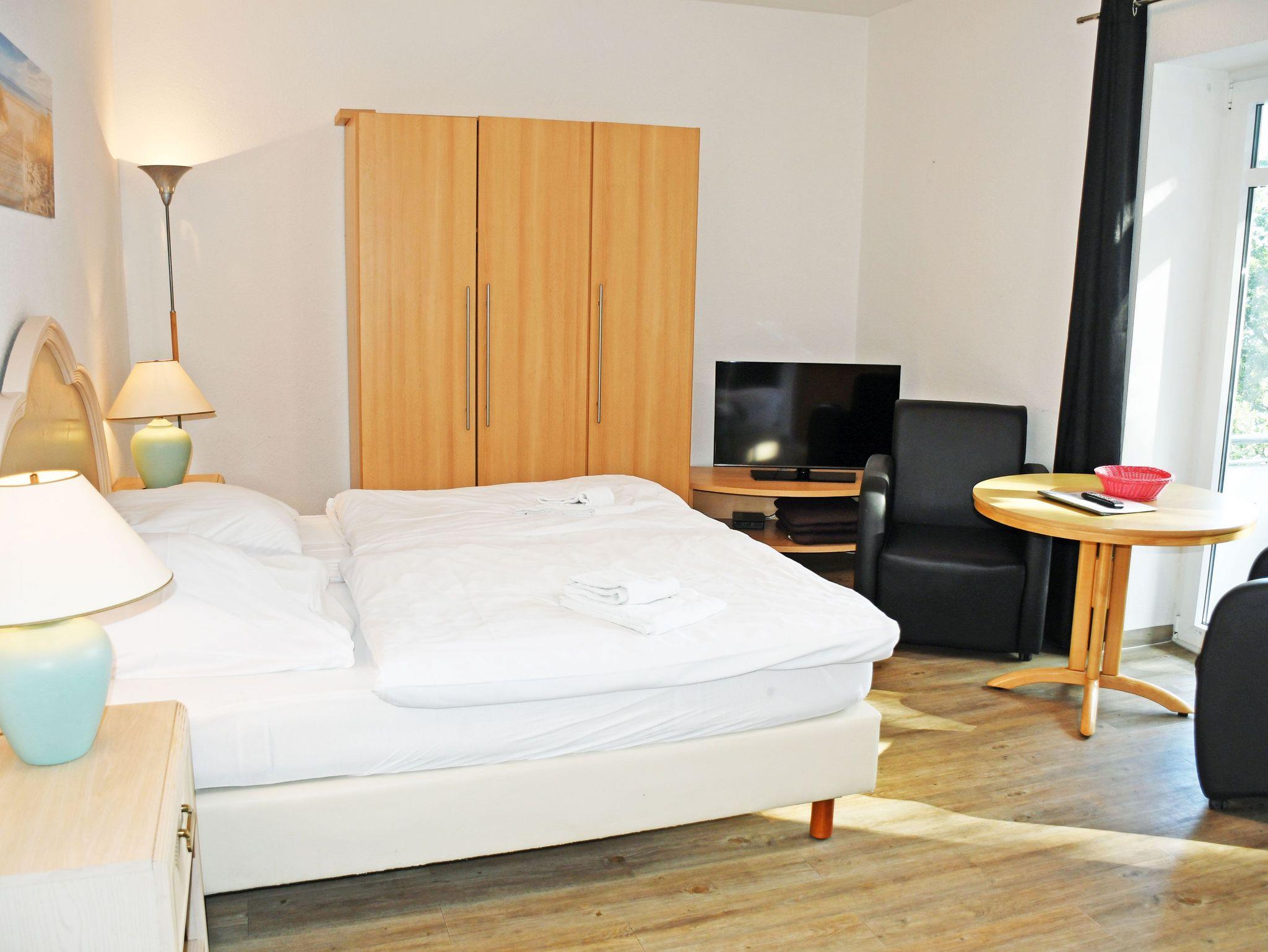 kombinierter Wohn-/Schlafraum mit Doppelbett (180 x 200 cm), Nachttischen, großem Kleiderschrank, Tisch mit 2 Ledersesseln, Anrichte mit TV, Kofferablage