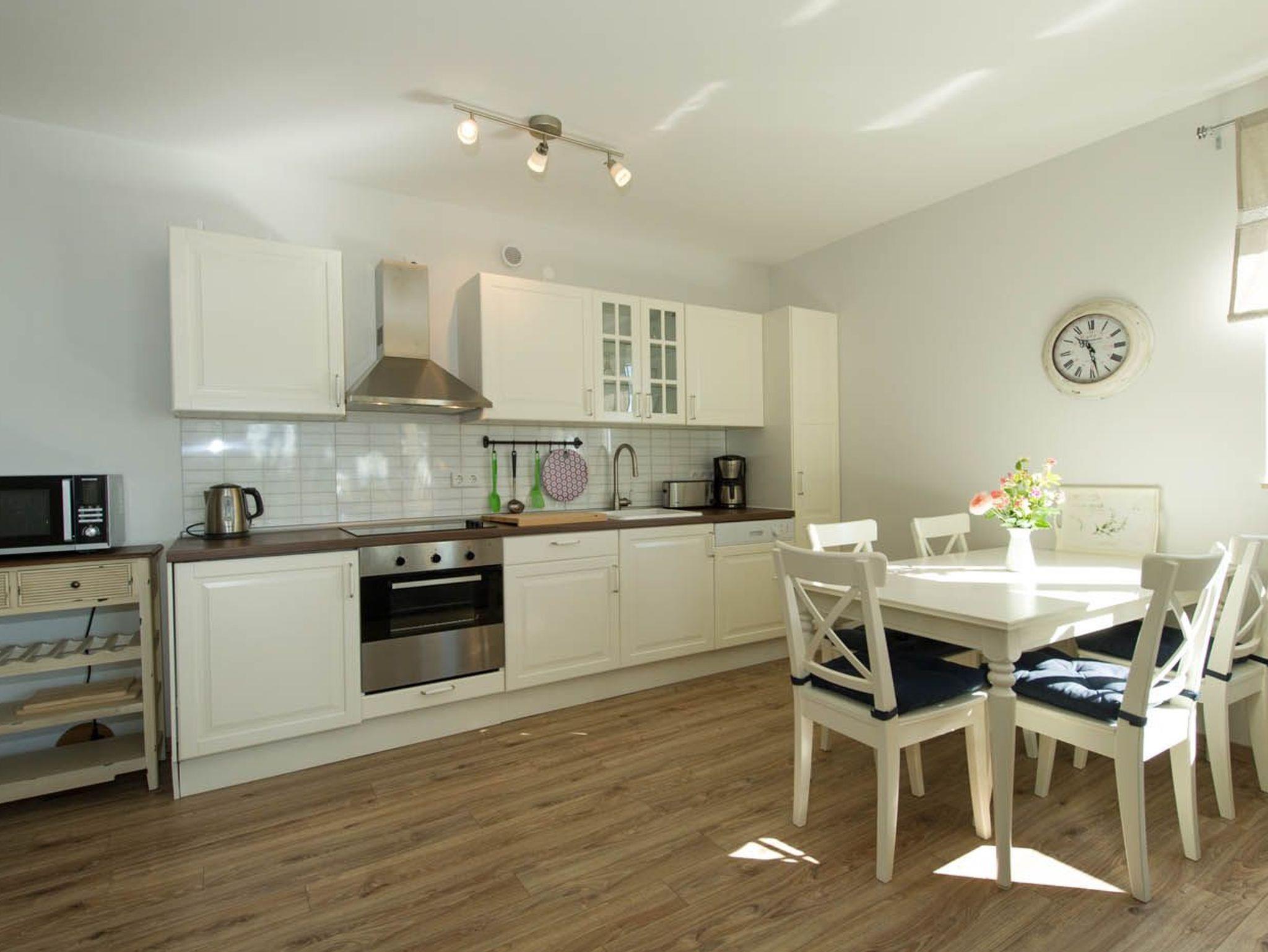 4-Platten-Cerankochfeld, Backofen, Dunstabzugshaube, Mikrowelle, großer Kühlschrank mit Gefrierfach, Geschirrspüler, Toaster, Kaffeemaschine, Wasserkocher, Eierkocher und hochwertigen Küchenutensilien