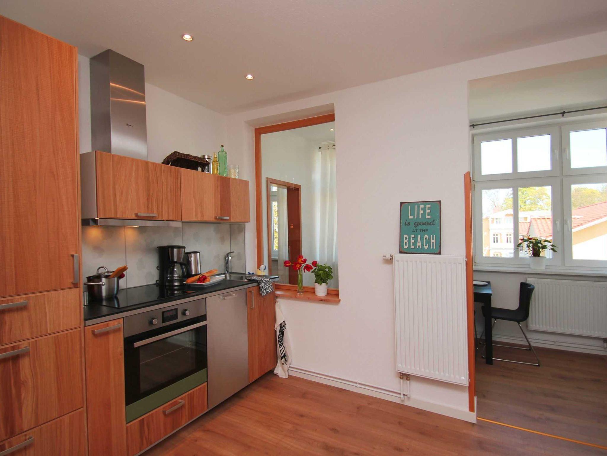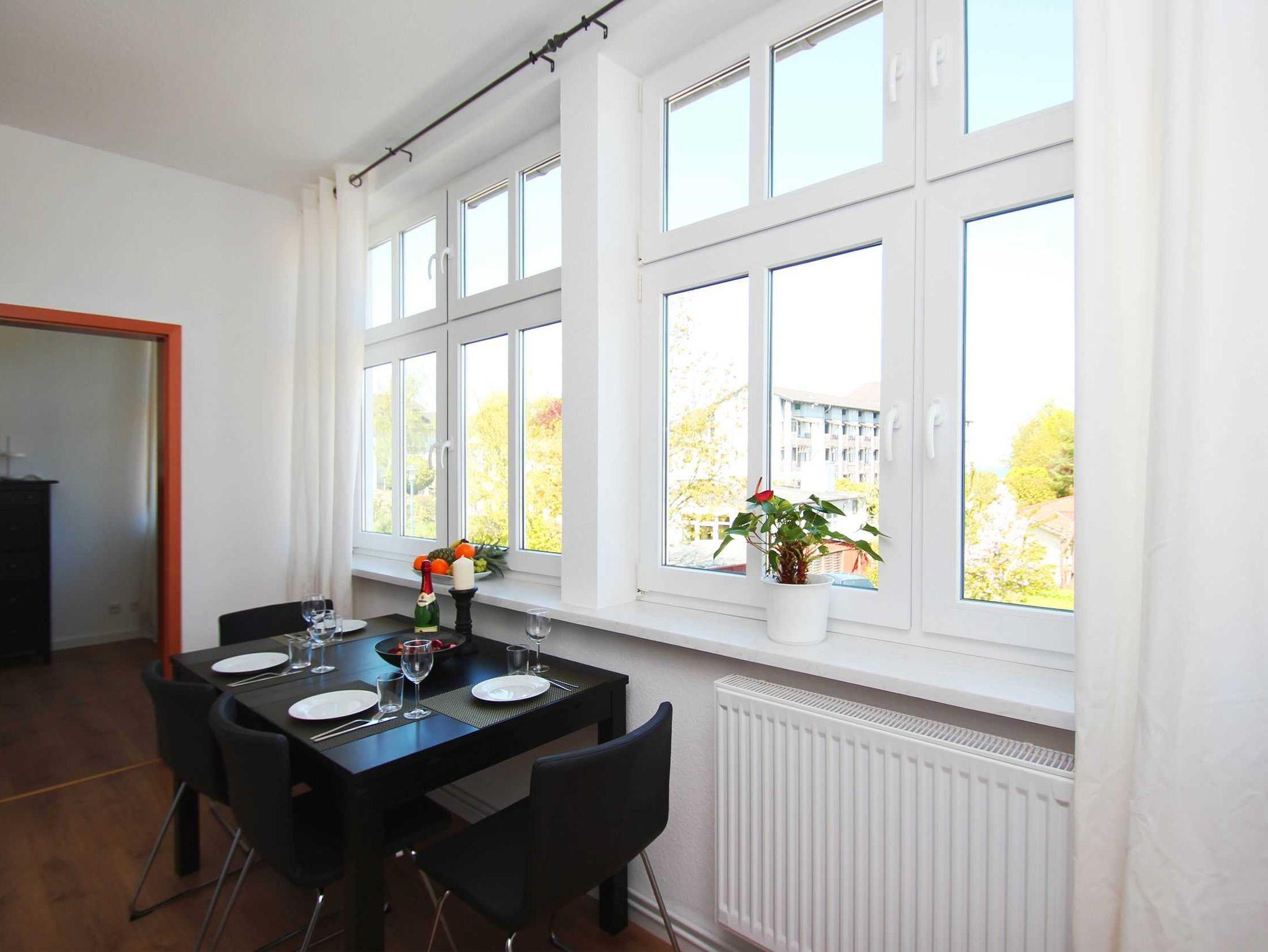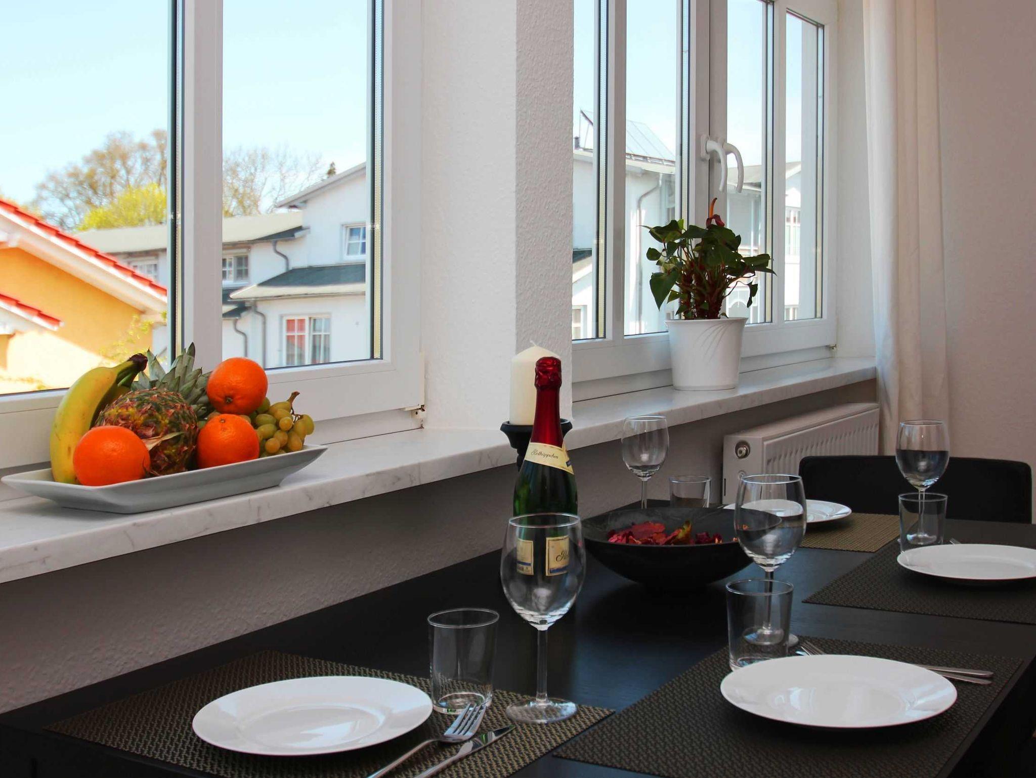 Die 3-Raum Ferienwohnung in der Villa Elise bietet für 4 Gäste ausreichen Platz. Der großzügige Wohnbereich verfügt über eine Couch und Flachbild TV. Angenzend an den Wohnbereich befindet sich ein separater Essbereich. Die Küche ist mit einem 4-Felder Ceranherd, Backofen, Geschirrspüler, Kühlschrank und sämtlichen Küchenutensilien ausgestattet. In der Wohnung befinden sich 2 Schlafzimmer, das eine mit einem Boxspringbett, das andere mit 2 Einzelbetten. Ebenfalls sind 2 Bäder mit Dusche und WC vorhanden.