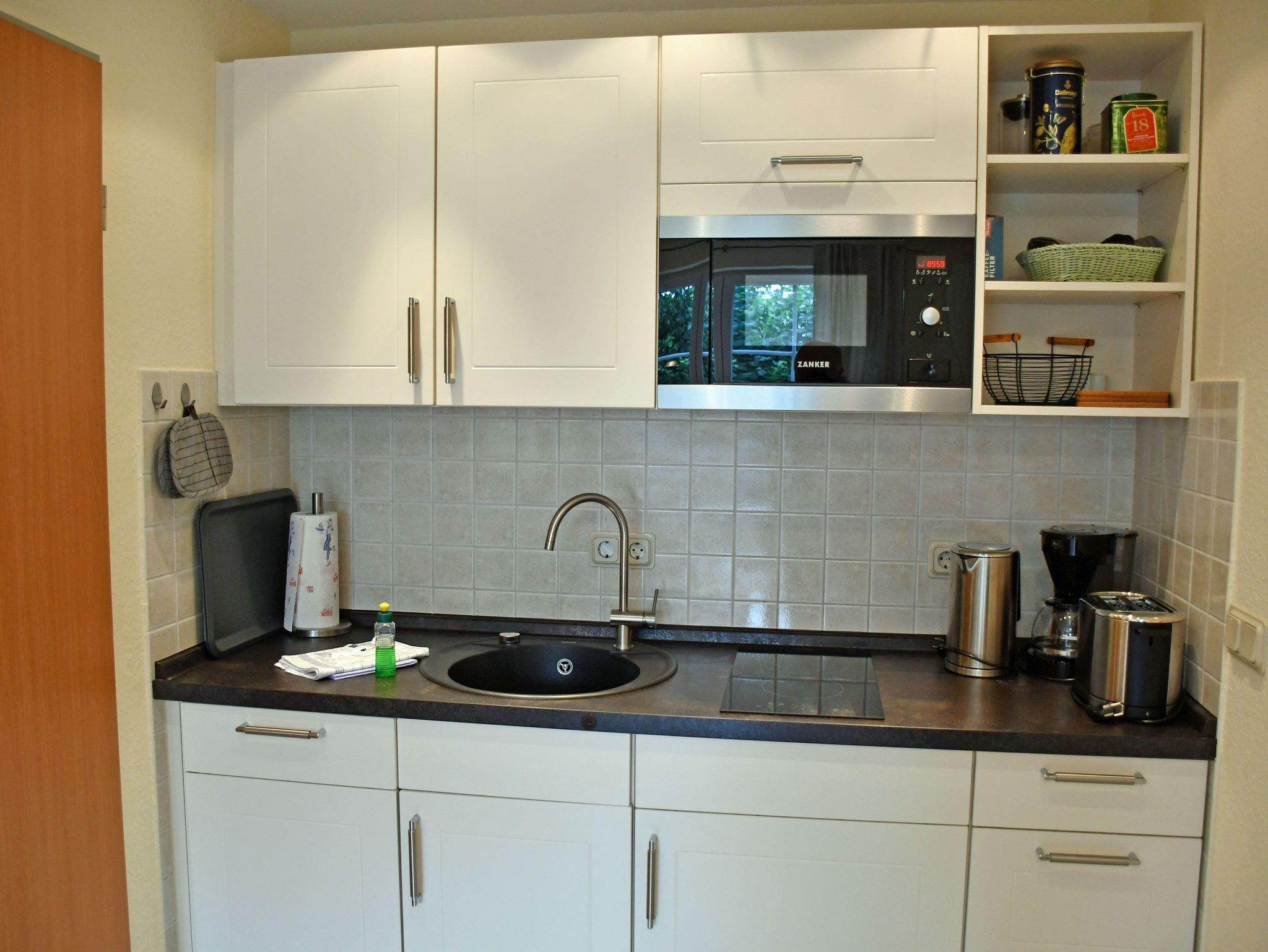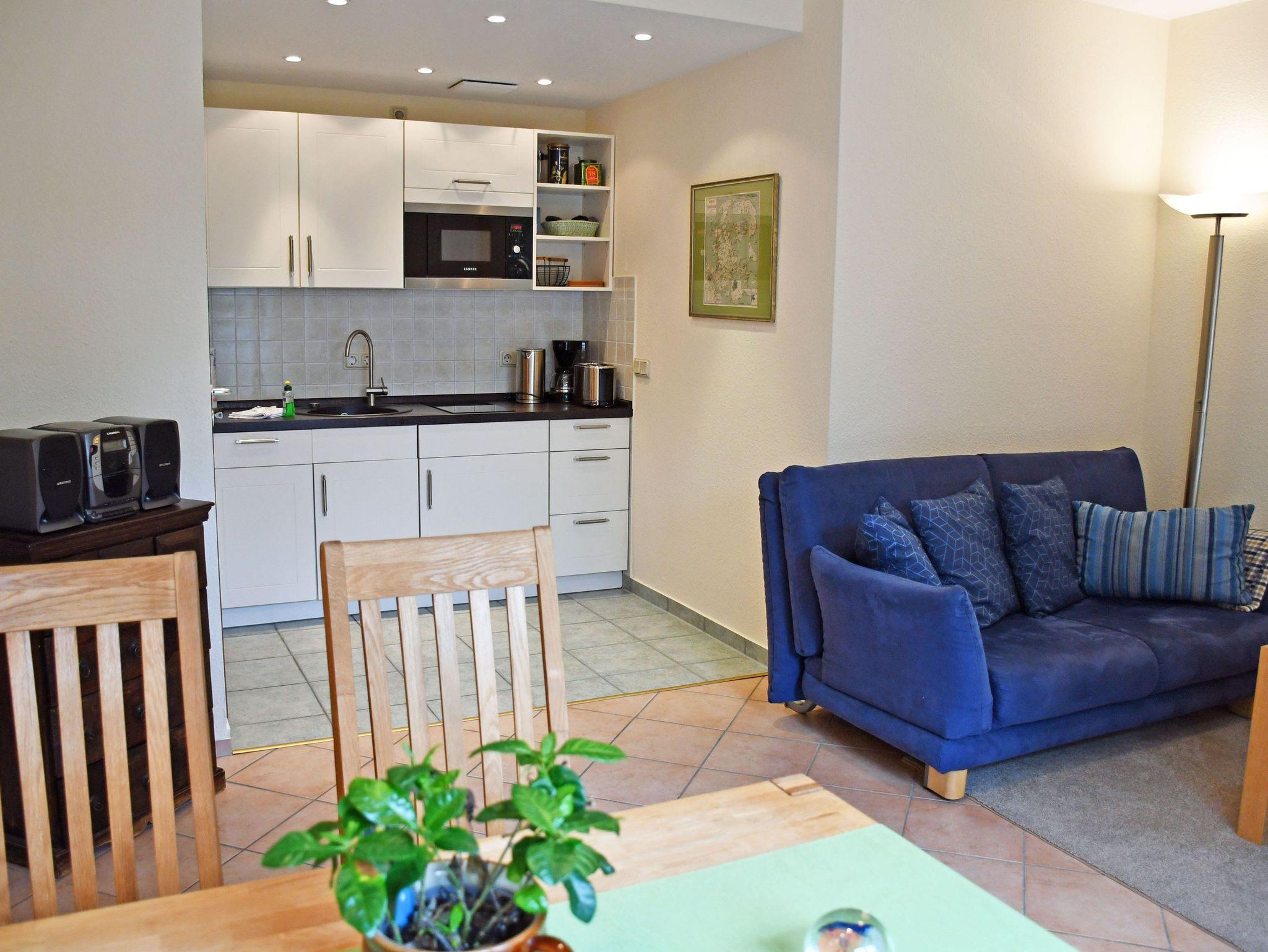 * Wohnraum mit einer gemütlichen Sitzecke mit TV sowie einer offenen Küchenzeile mit Cerankochfeld (2 Platten), Geschirrspüler, Mikrowelle, Kühlschrank mit Gefrierfach, Filter-Kaffeemaschine, Toaster und Wasserkocher