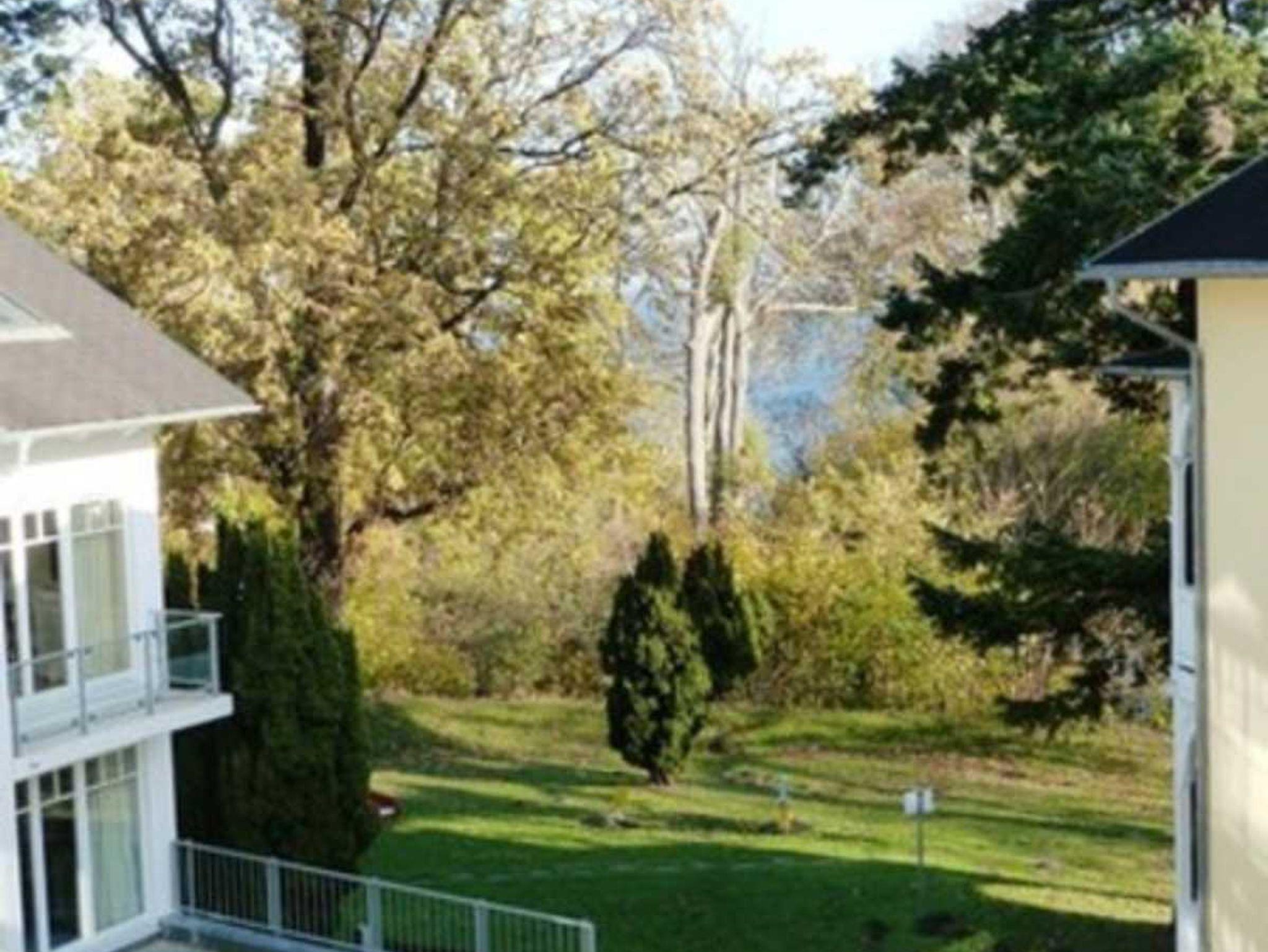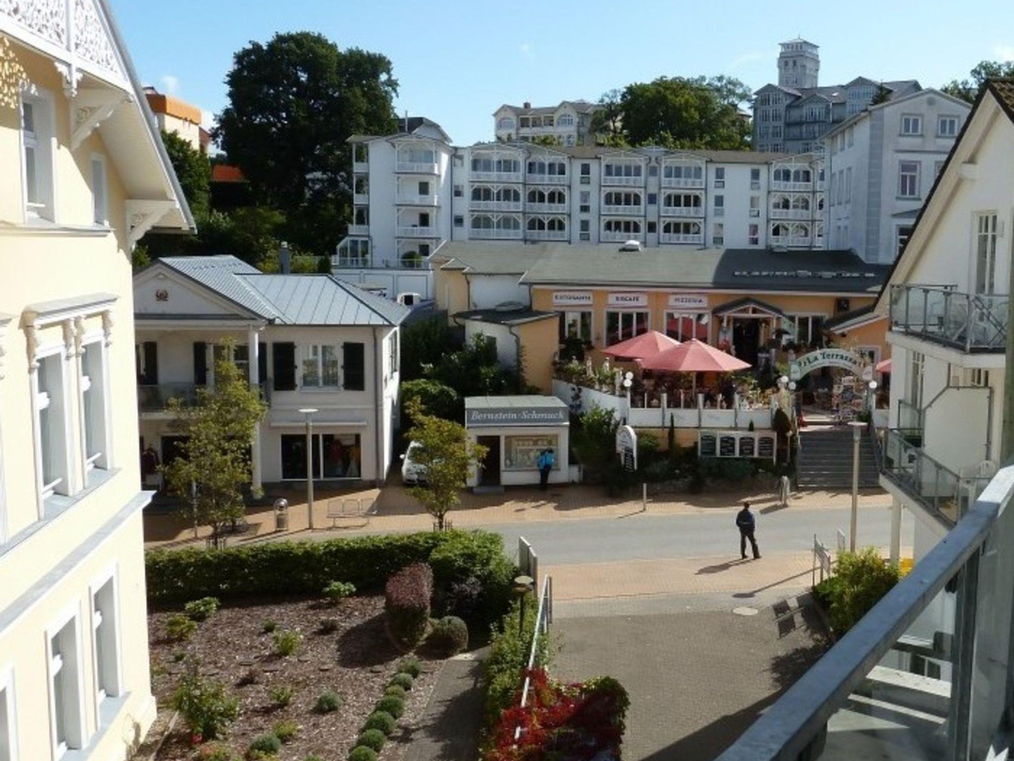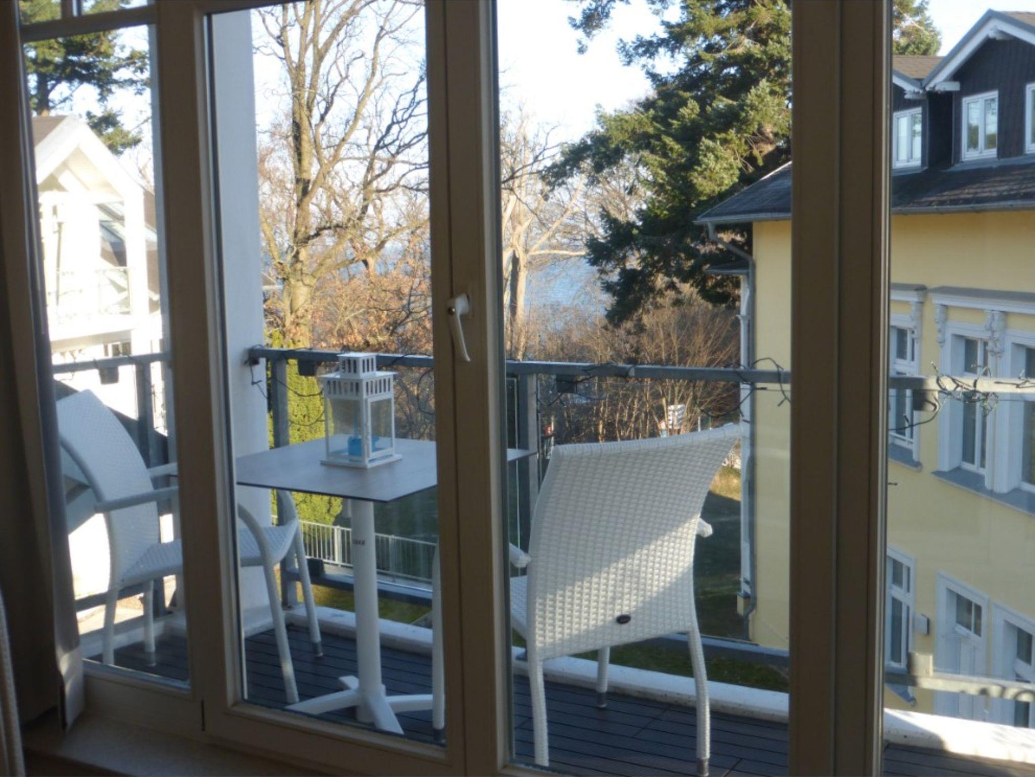 Dies ermöglicht einen traumhaften Blick in den Garten der Villa Granitz und zur Ostsee. In der Vor- und Nachsaison können Sie vom Balkon mit Gartenmöbel durch die Baumkronen auf die Ostsee schauen, im Sommer auf die dann begrünte Waldpromenade.