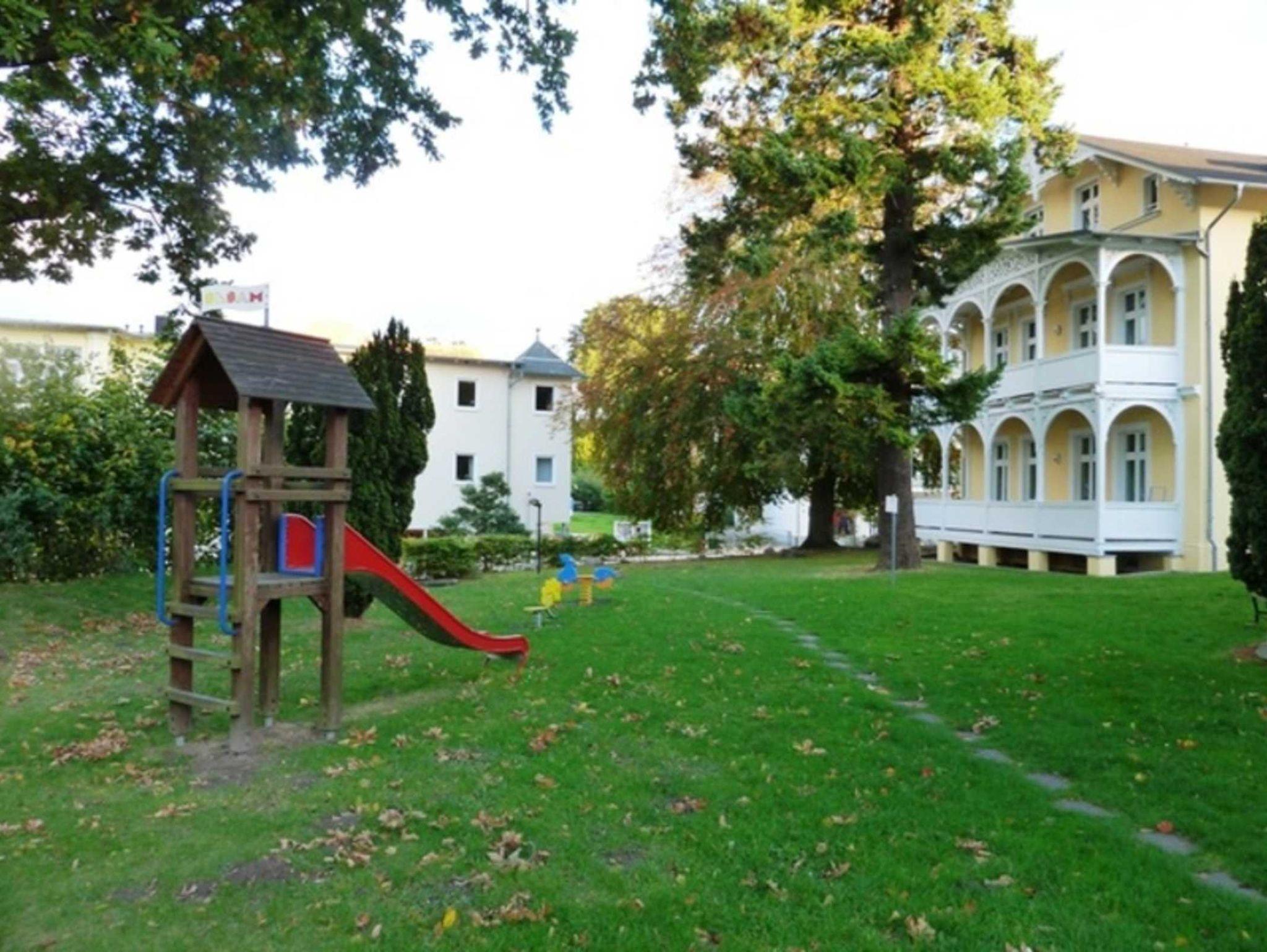 Für Kinder steht eine große Rasenfläche mit Spielgeräten zur Verfügung.