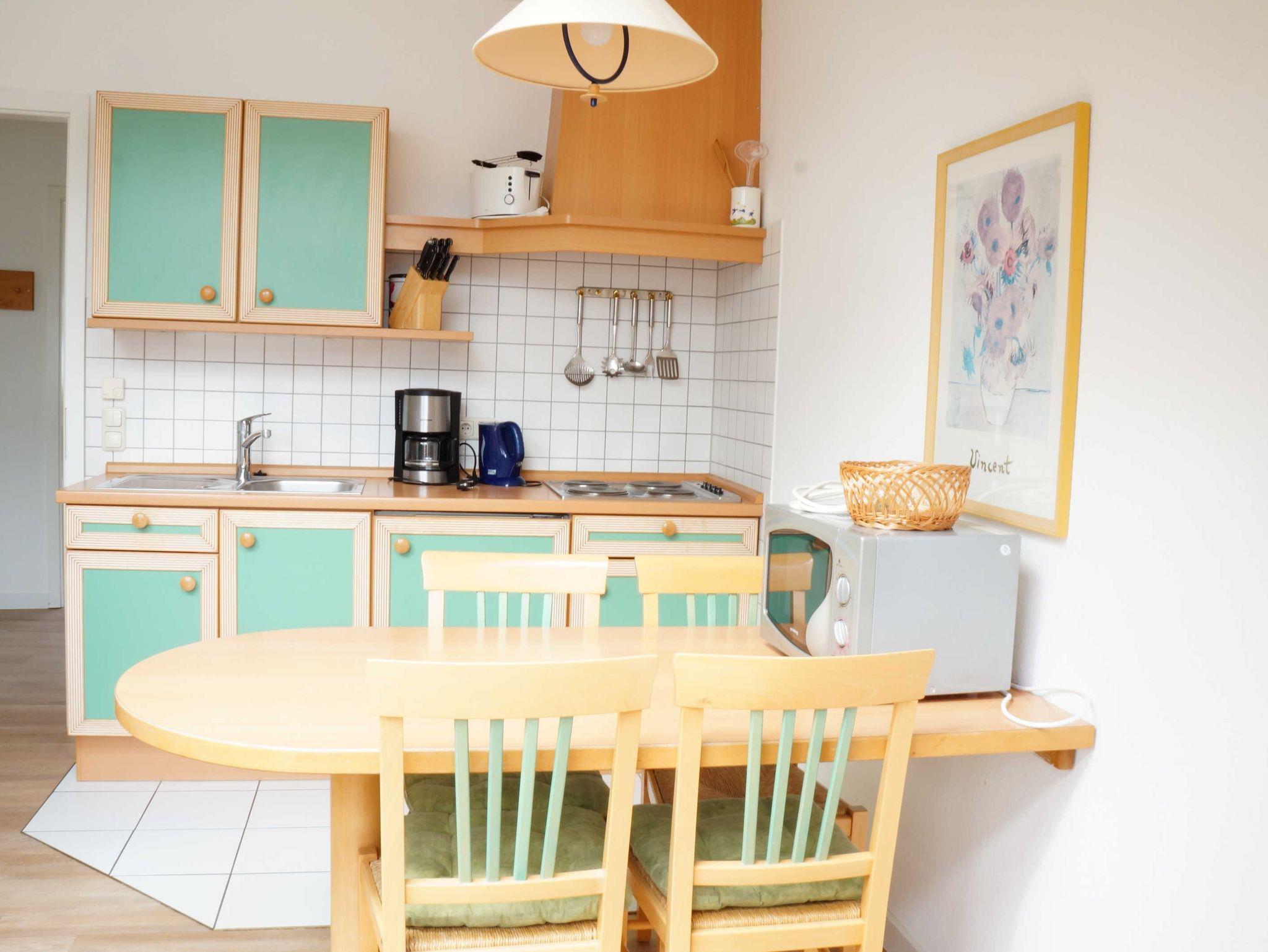 Die Wohnung verfügt über ein Schlafzimmer mit zwei Einzelbetten, Kleiderschrank und riesigem Atelierfenster mit Meerblick und ein Wohnzimmer mit mit Sitzecke (Doppelschlafsofa) , TV und Essecke. Eine komplett eingerichtete Küchenzeile (4-Plattenherd, Kühlschrank, Mikrowelle, Kaffeemaschine, Toaster, komplett Geschirr, etc.) als auch Dusche und WC gehören zur Wohnung.
