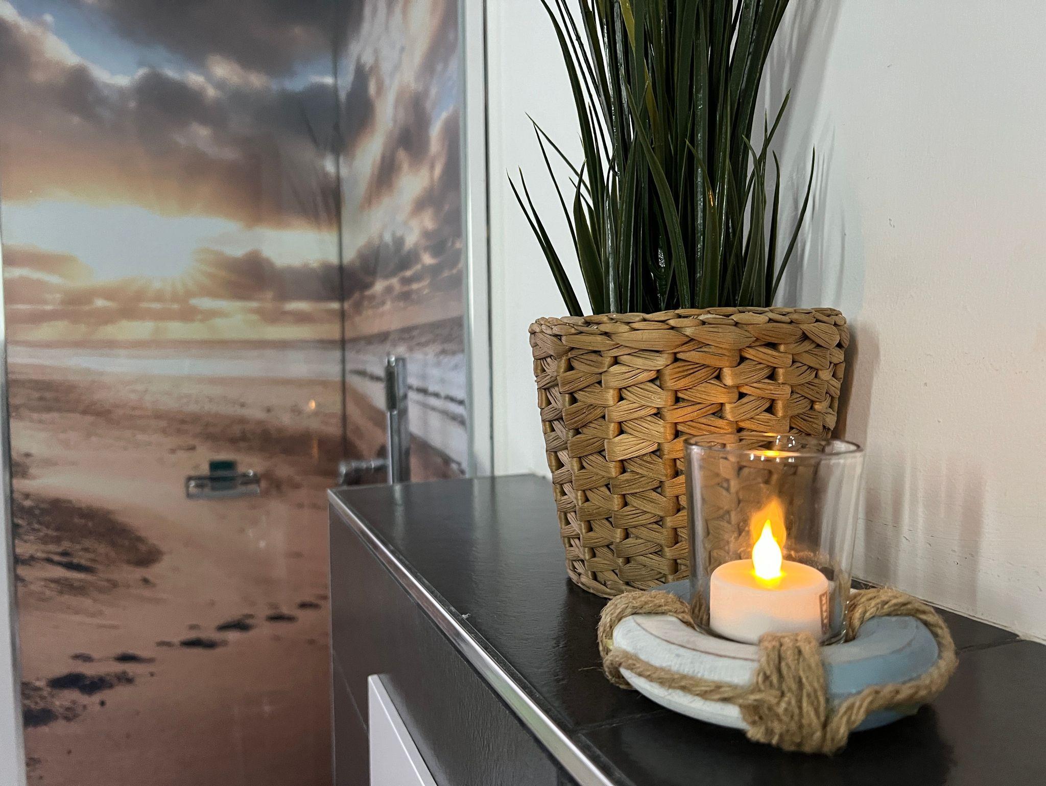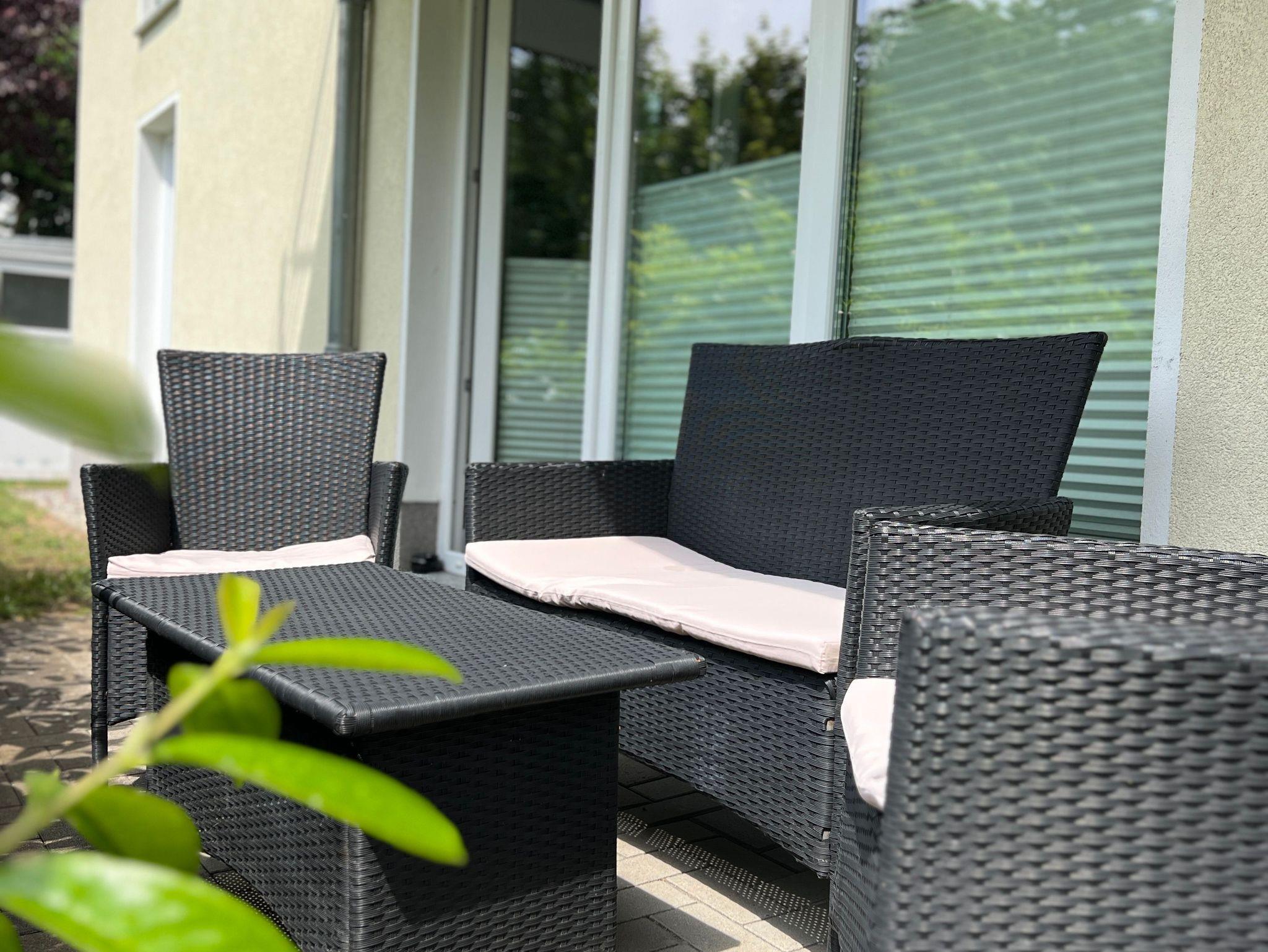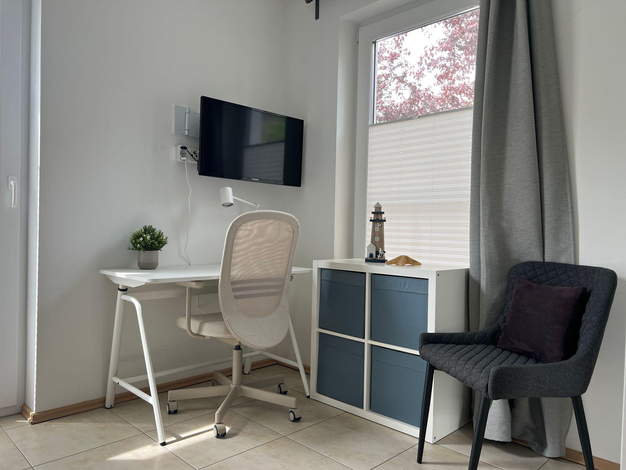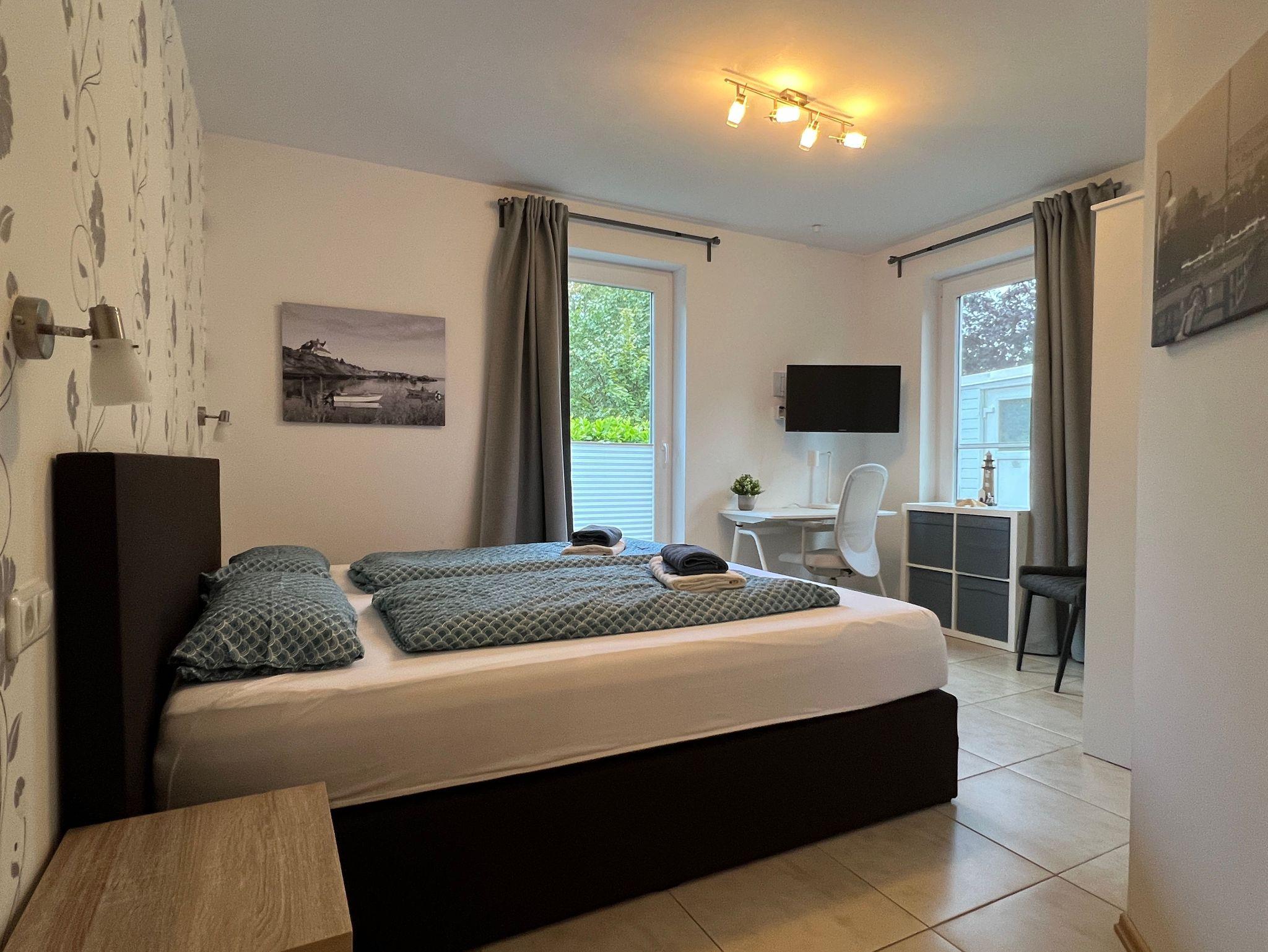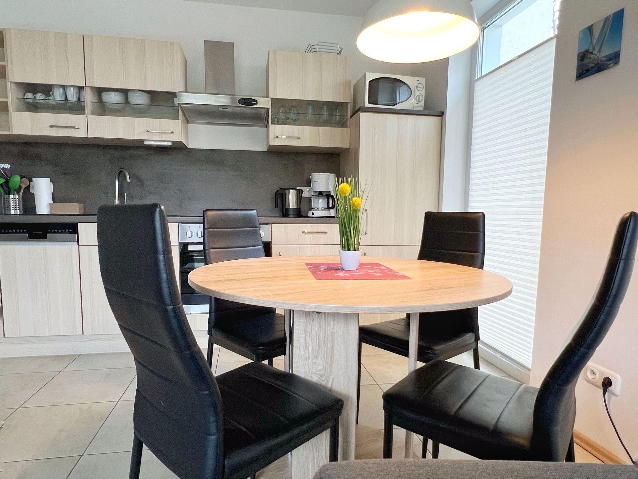 Die Wohnung befindet sich im Erdgeschoss und bietet einen hellen und gemütlichen Wohnbereich mit komfortablem Schlafsofa, eine voll ausgestattete Küche sowie ein Schlafzimmer mit bequemem Bett (160x200). Das moderne Badezimmer ist mit einer großzügige Dusche ausgestattet.