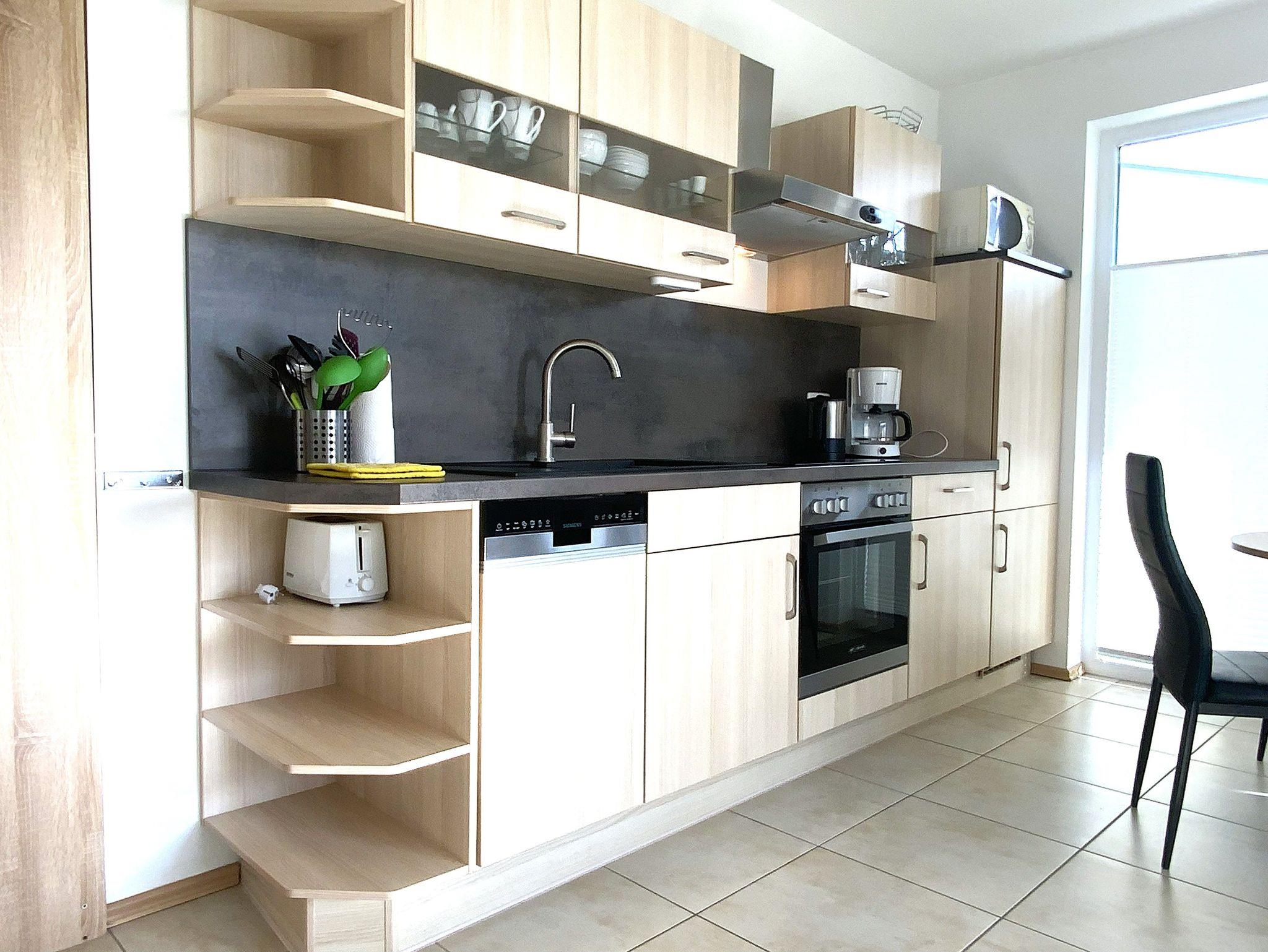 • kompletteingerichtete offene Küche mit Geschirrspüler, Wasserkocher, Kaffeemaschine,, Toaster, Geschirr, Besteck
