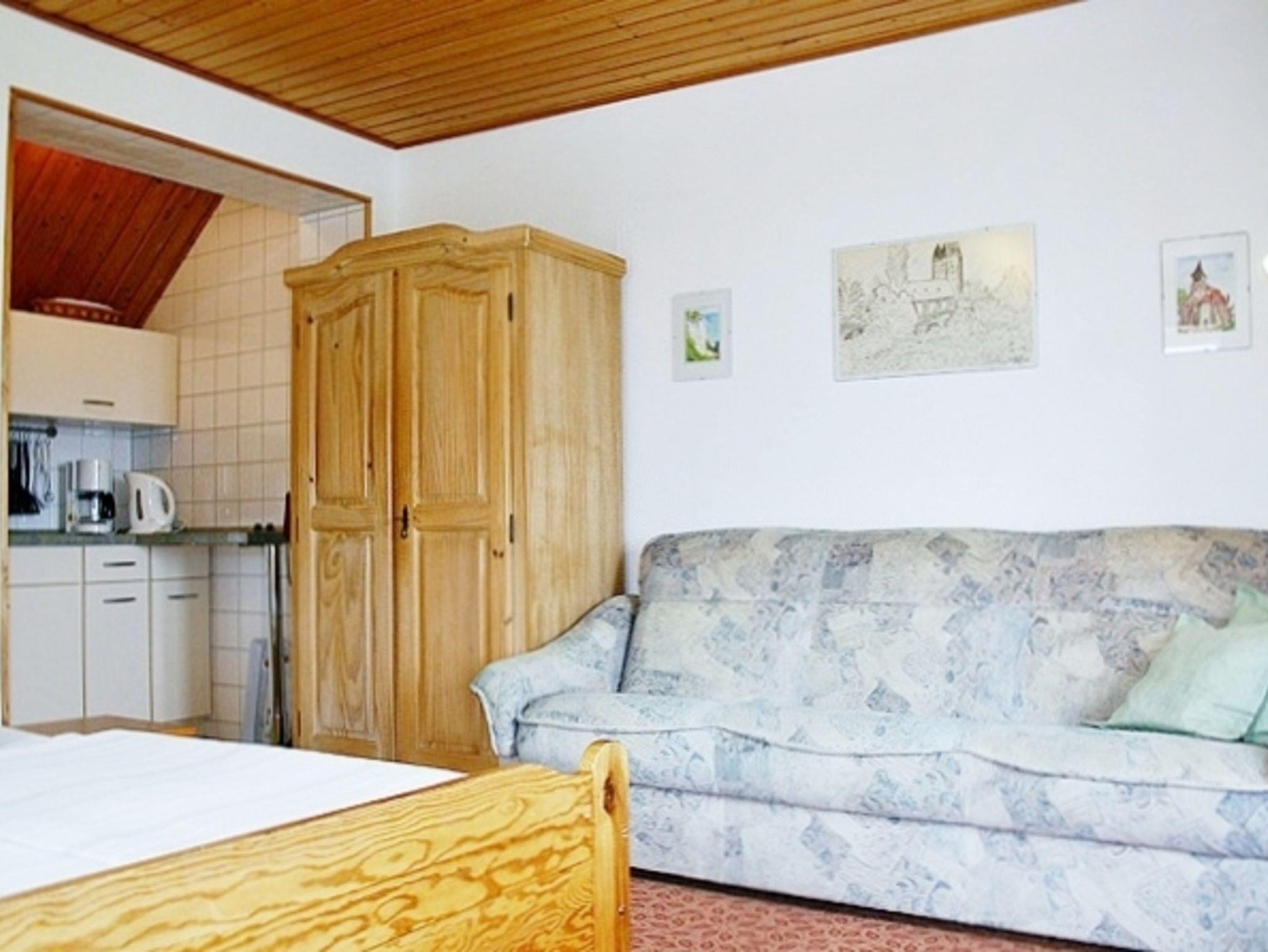 Ferienwohnung West verfügt über kombinierte Wohn-, Schlafraum mit TV und Radio, eine Einbauküche, Bad (WCund Dusche), Heizung. In der Westwohnung (ca. 22 qm) befindet sich eine Couch. Die Einbauküche ist ausgestattet mit: Kühlschrank, 2 Ceranfeldkochplatten, Wasserkocher, Kaffeemaschine, Toaster, Geschirr …
