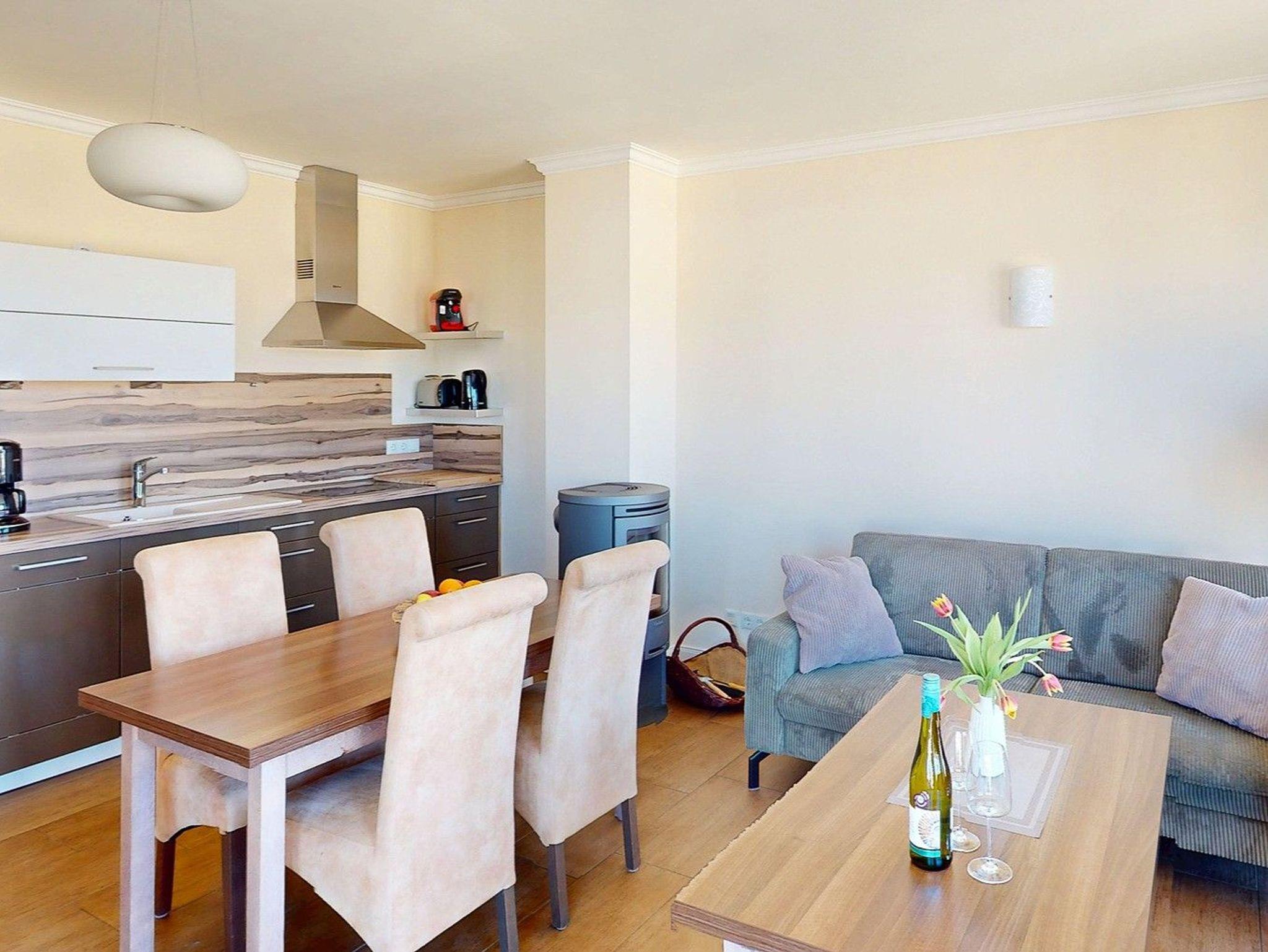 Genießen Sie die exklusive Ferienwohnung mit Sauna, Kamin und Balkon in Göhren, nur wenige Gehminuten vom Strand entfernt.
