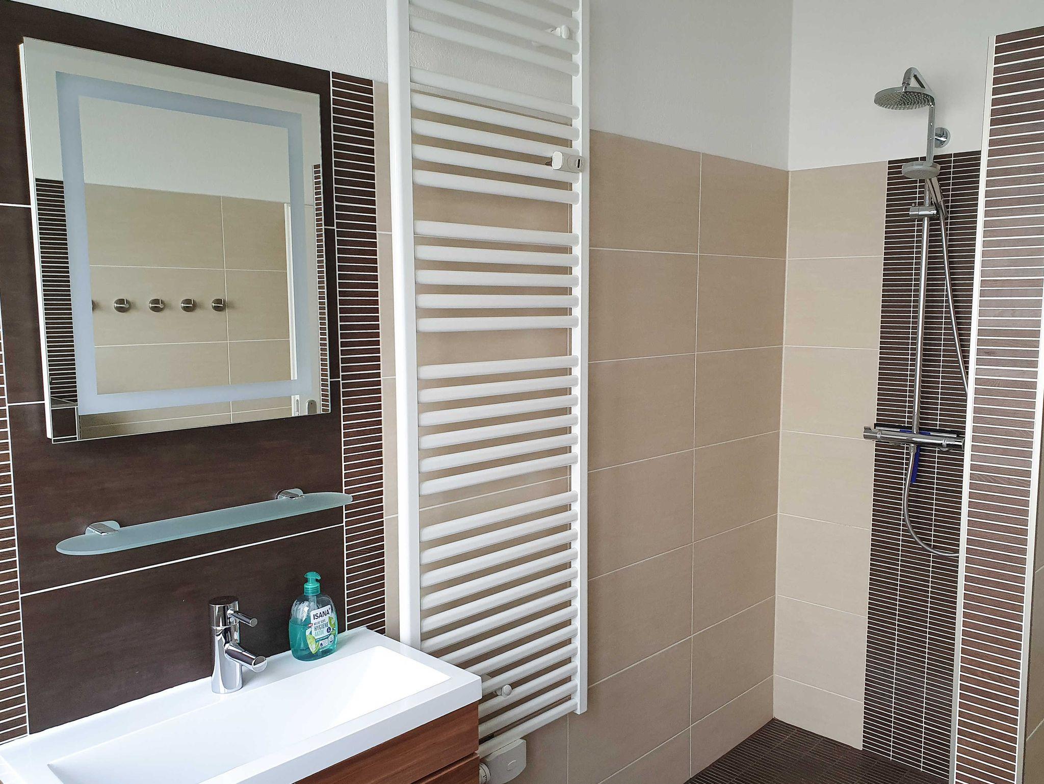 * einheitliche Dielenfliesen im gesamten Wohnbereich außer im ebenfalls gefliesten luxuriösen Bad, ebenerdige Duschkombination
