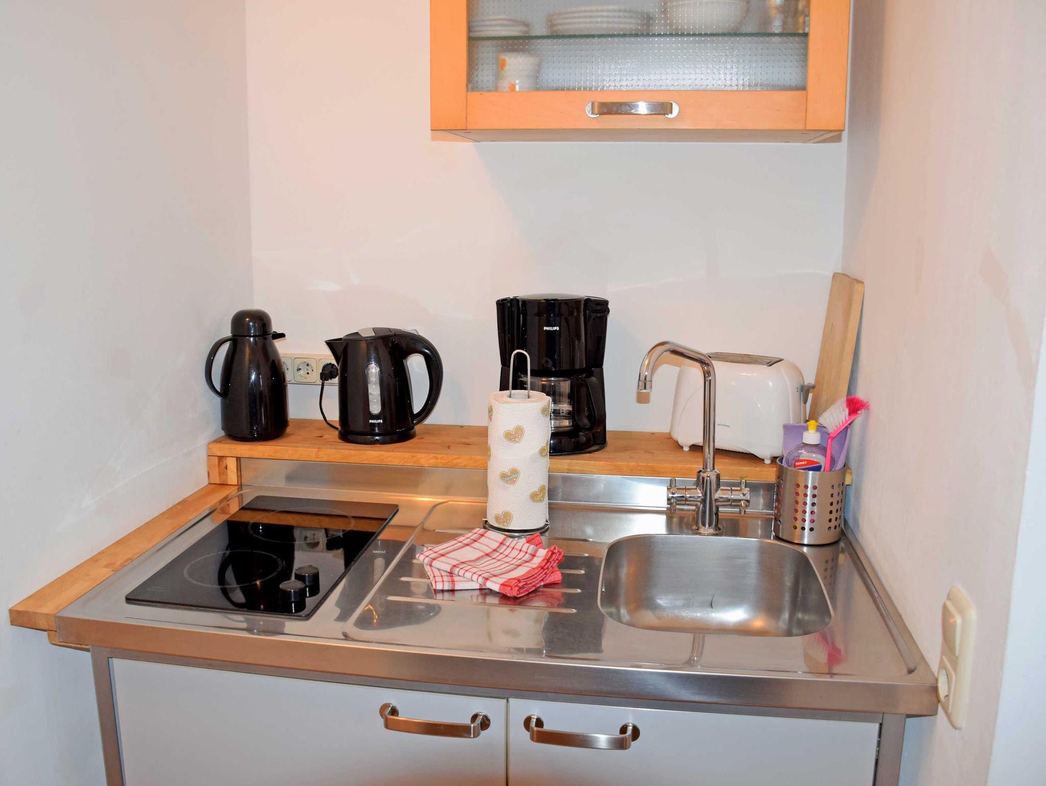 Wohnfläche ca. 30 m² für max. 2 Personen sowie einem Kleinkind bis 3 Jahren. Sollten Sie ein Kinderreisebett wünschen, bitten wir Sie dieses bei Buchung mit anzuegeben. Der Eingangsbereich ist mit einer einfach ausgestatteten Pentriküche ausgestattet: 2-Zonen-Ceran-Kochfeld, kleinem Kühlschrank mit Frostfach und Spüle, Toaster, Kaffeemaschine, Wasserkocher und Küchenutensilien.