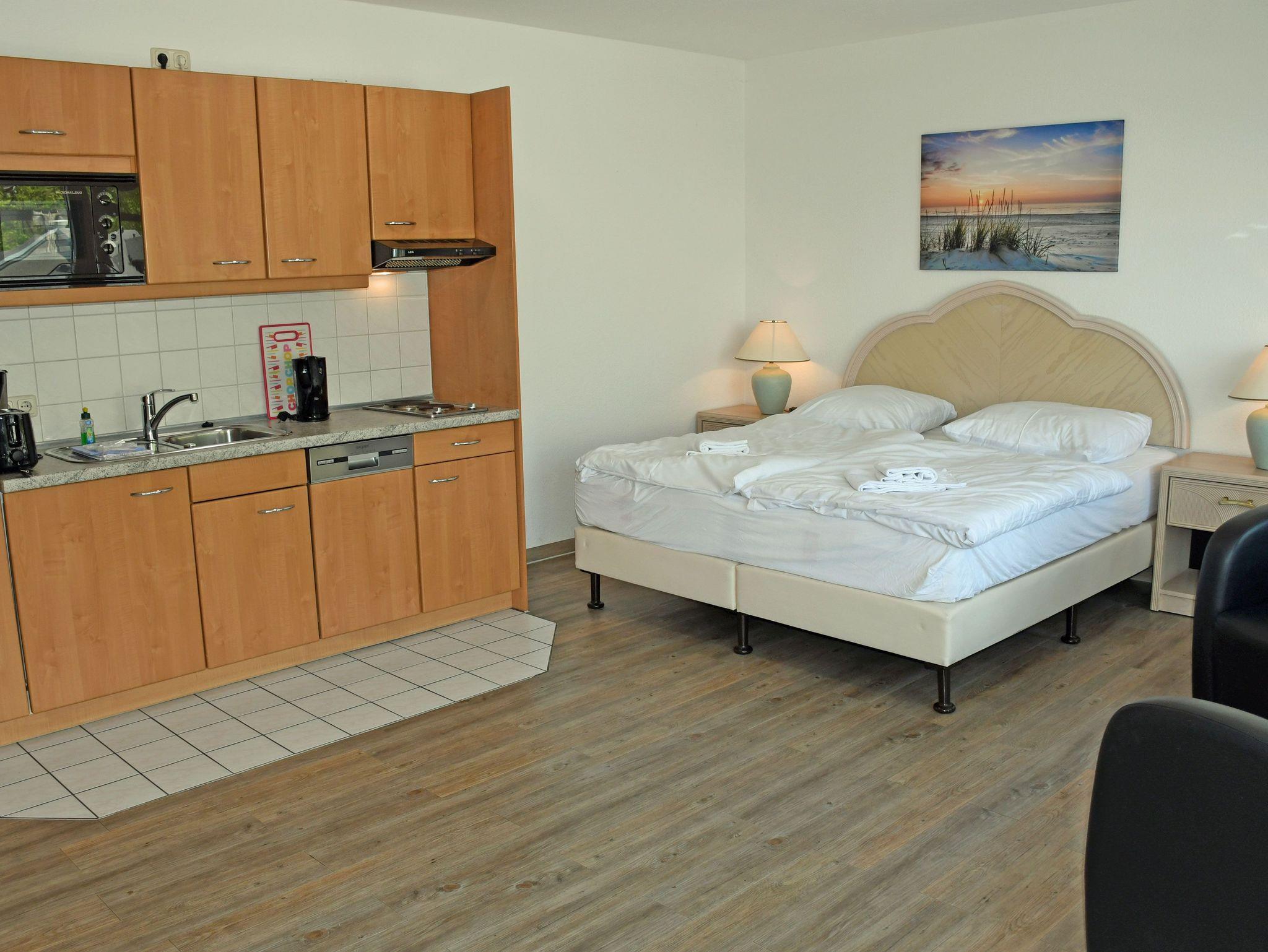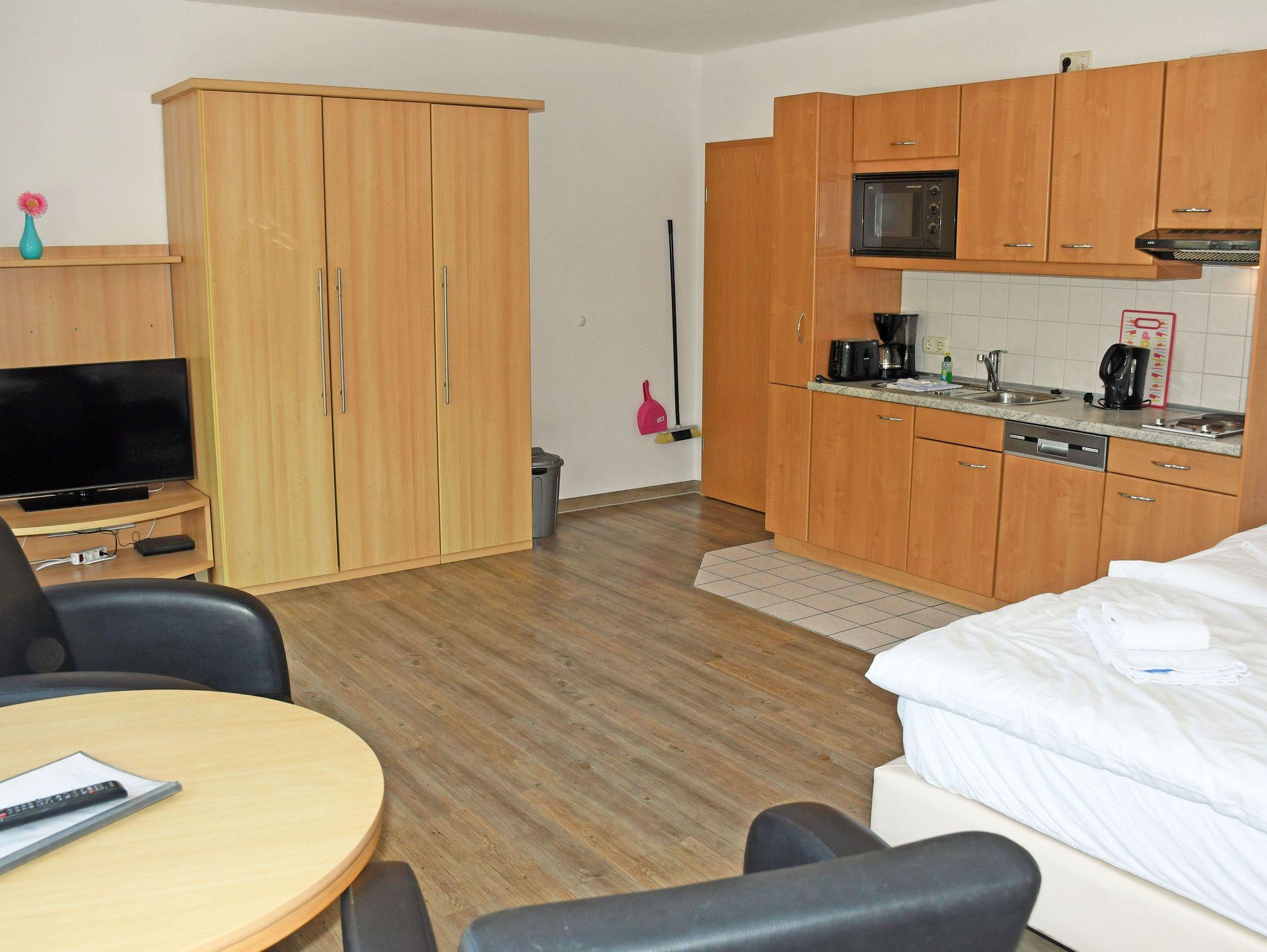 Unsere ruhig gelegenen, hellen und lichtdurchfluteten 1-Raum-Ferienwohnungen mit Balkon sind wie folgt ausgestattet:
